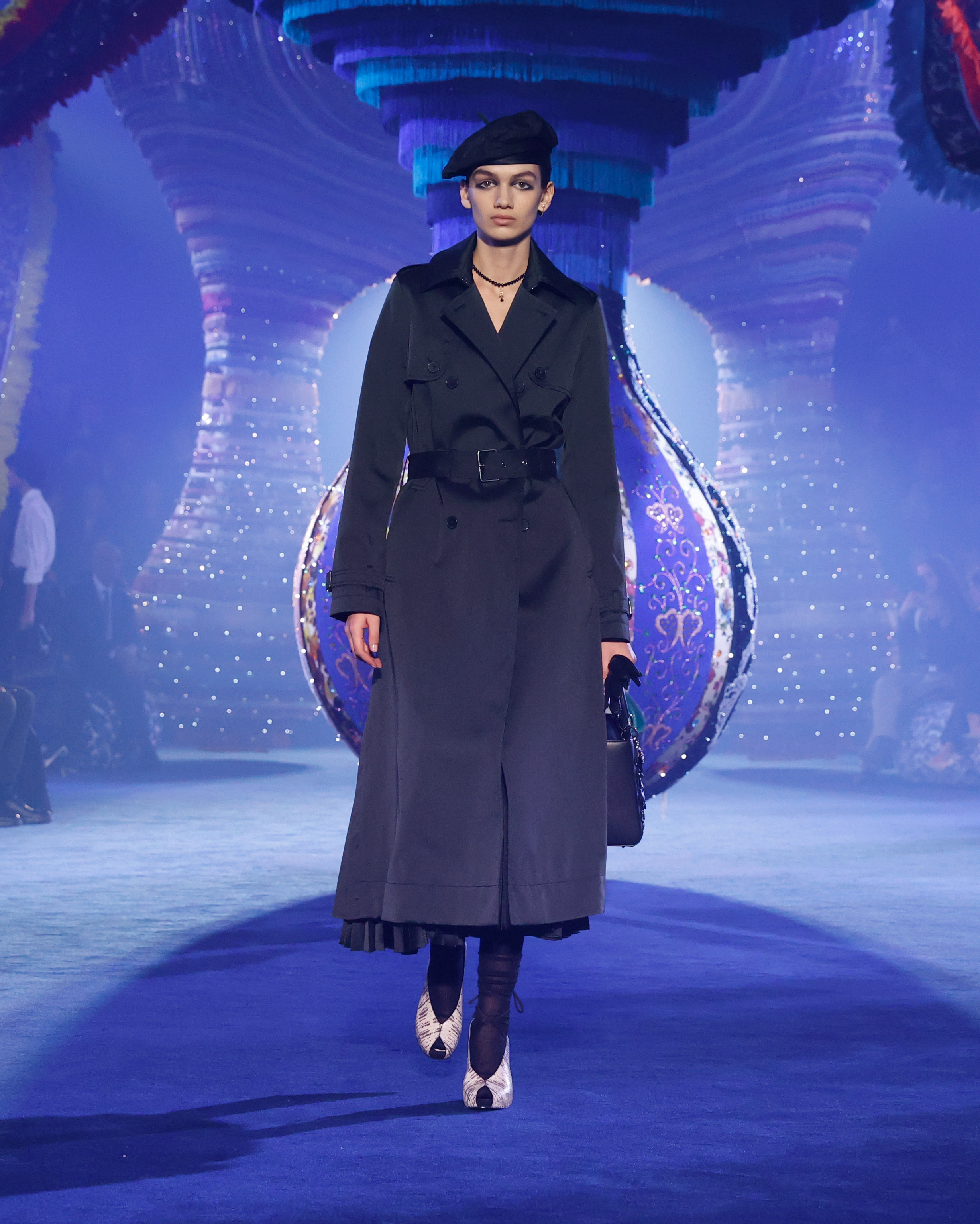 Dior Creative Director Maria Grazia Chiuri sees every collection as an occasion to reflect on the function of clothing, evaluating the role it plays in relation to the body and to fashion. For the Autumn-Winter 2023-2024 collection, the creative director delves into the history of Dior by revisiting the 1950s for its ready-to-wear line, exploring French style in three different personas: Catherine Dior, Édith Piaf, and Juliette Gréco. Floral motifs are interwoven into metallic thread that tricks the eye into seeing life in the fabric, canceling out contours and alluding abstraction. The Autumn Winter line is made up of primary colors such as blue, topaz yellow, ruby, emerald, and shades of tartan cover straight skirts, coats, and jackets with embroidered spurts of lights. Honoring the undefined and ever evolving image of femininity, this line proposes emotional paths to the upcoming generation of women shaping our future.