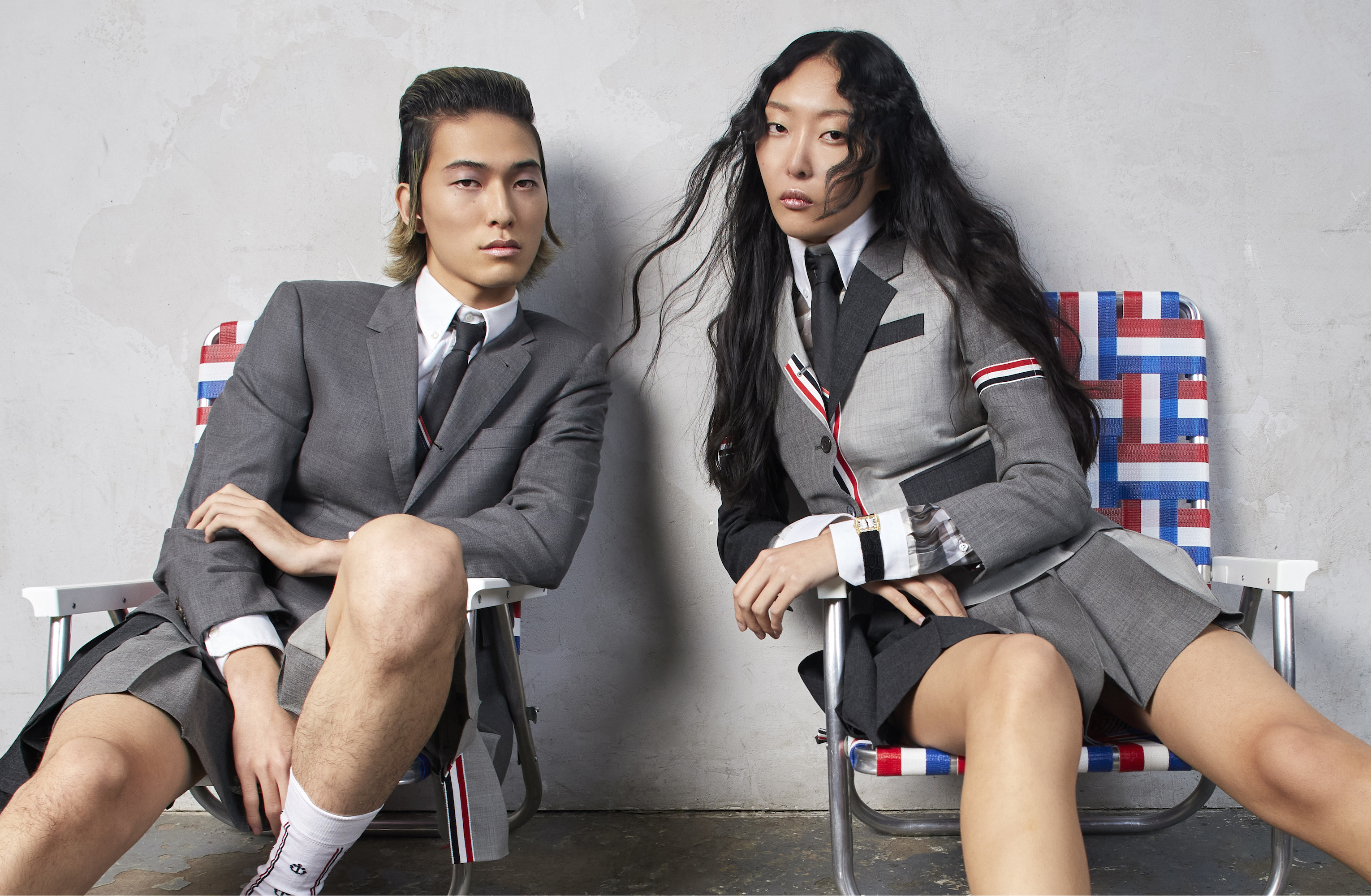 Left to right: Fuma wears THOM BROWNE blazer, shirt, tie, skirt, socks, and shoes. Hey Yeon Yoo wears THOM BROWNE blazer, shirt, tie, skirt, and socks.