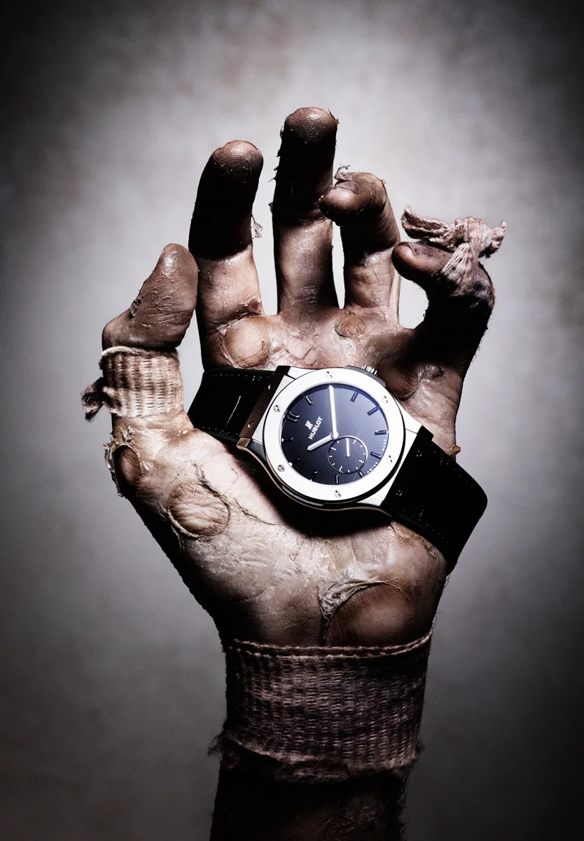 Classic Fusion watch in titanium with black rubber and alligator strap by **Hublot**.