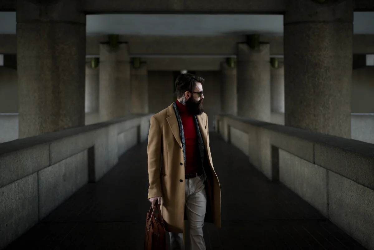 CAMEL WOOL COAT BY **NICOLE FARHI**, PATTERNED SUIT JACKET BY **VIVIENNE WESTWOOD MAN**, TURTLENECK SWEATER BY **JOHN SMEDLEY**, JEANS BY **HUDSON**, LEATHER BELT BY **HARDY AMIES**, SUNGLASSES BY **LINDA FARROW**, AND LEATHER ‘PALISSY’ BAG BY **OPPERMANN**.
