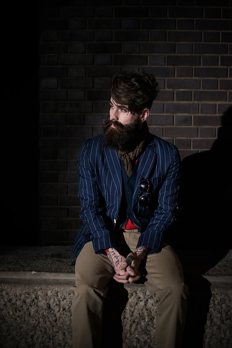 STRIPED SUIT JACKET BY **HACKETT**, COTTON VEST AND CHECK SCARF WITH POLKA DOTS BY **KENT & CURWEN**, SWEATER BY **JOHN SMEDLEY**, JEANS BY **LEE**, AND GLASSES BY **LINDA FARROW**.