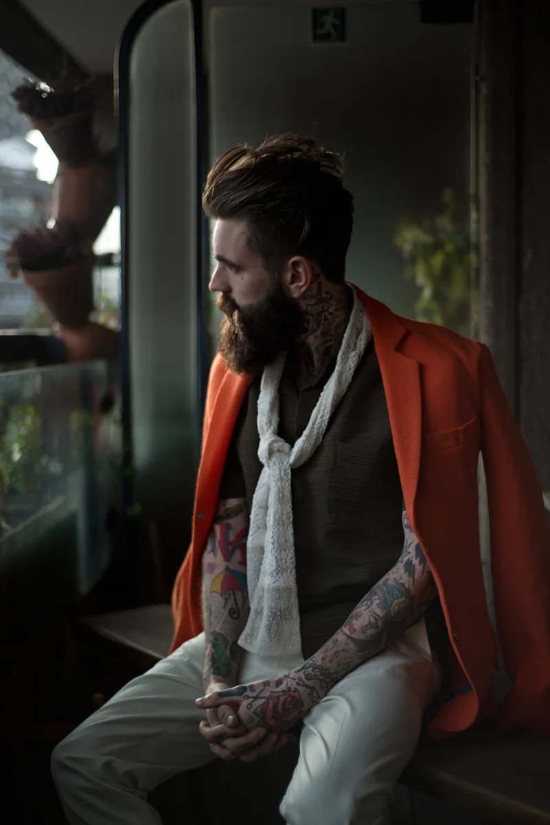 JACKET BY **AGI & SAM**, SHIRT BY **NICOLE FARHI**, TAILORED TROUSERS BY **PAUL SMITH**, AND LACE SCARF BY **MARWOOD**.