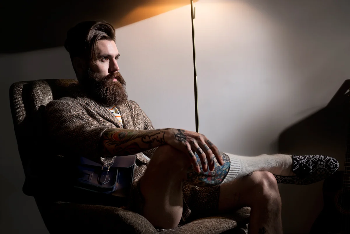 SHORT SUIT BY **ALAN TAYLOR**, STRIPED T-SHIRT BY **OLIVER SPENCER**, BLACK AND WHITE PATTERN SLIPPERS WITH TASSELS BY **LOUIS LEEMAN**, WOOL SOCKS BY **MARWOOD**, AND LEATHER SATCHEL BAG BY **THE CAMBRIDGE SATCHEL COMPANY**.