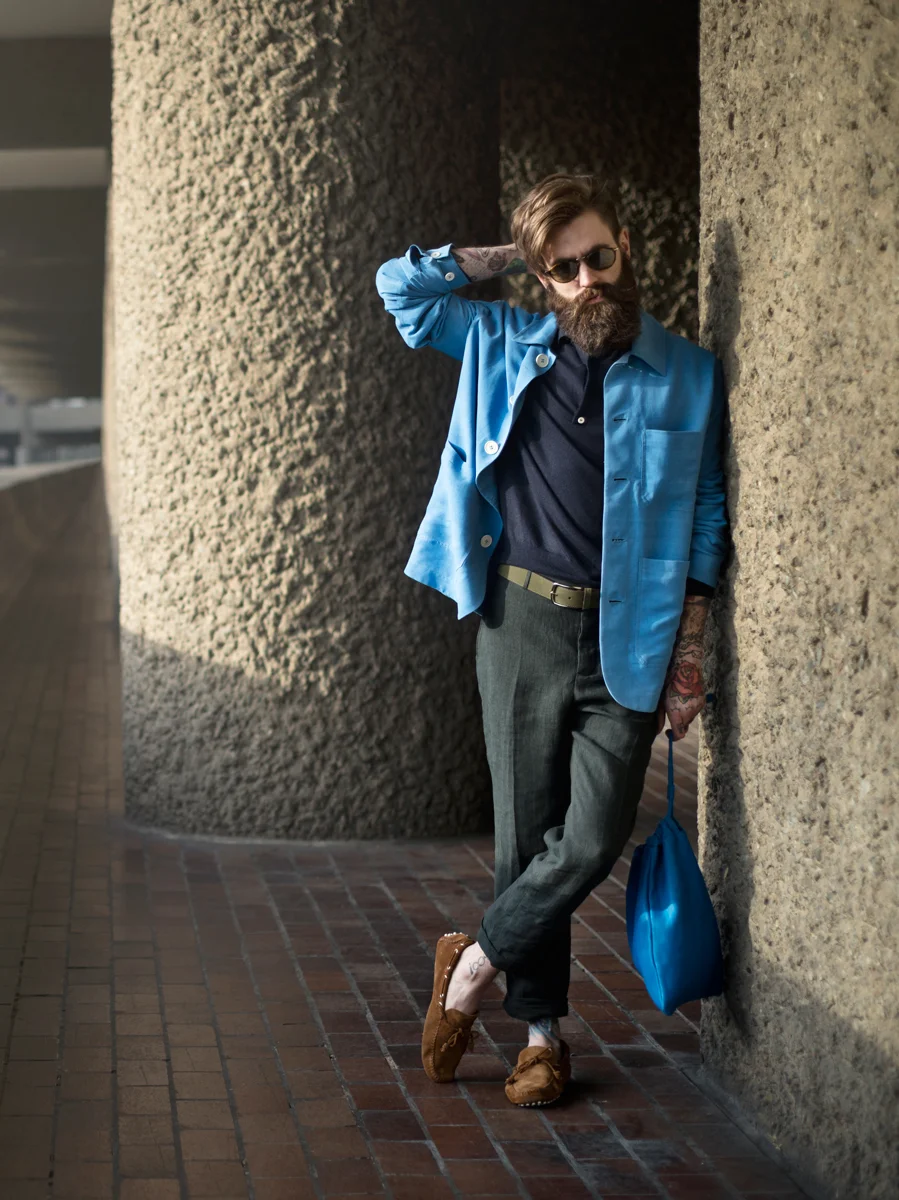 LIGHTWEIGHT ARTIST’S JACKET AND LINEN TROUSERS BY **BURBERRY**, KNIT POLO TOP BY **ESK**, SUEDE TASSEL LOAFERS BY **MR. HARE**, SUEDE BELT BY **PAUL SMITH**, AND TORTOISE SHELL SUNGLASSES BY **PERSOL**.