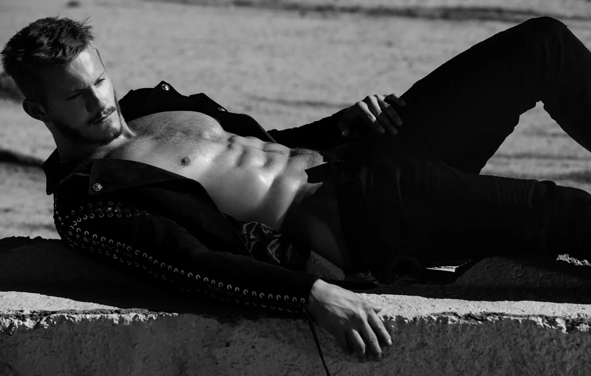 Jacket and boots by **Tom** **Ford**, Denim Shirt by **Cult of Individuality**, Tank top by **Hermès**, Denim jeans by **Hudson** **Jeans**, Leather Belt by **Salvatore** **Ferragamo**, and Sunglasses by **Gucci**.
