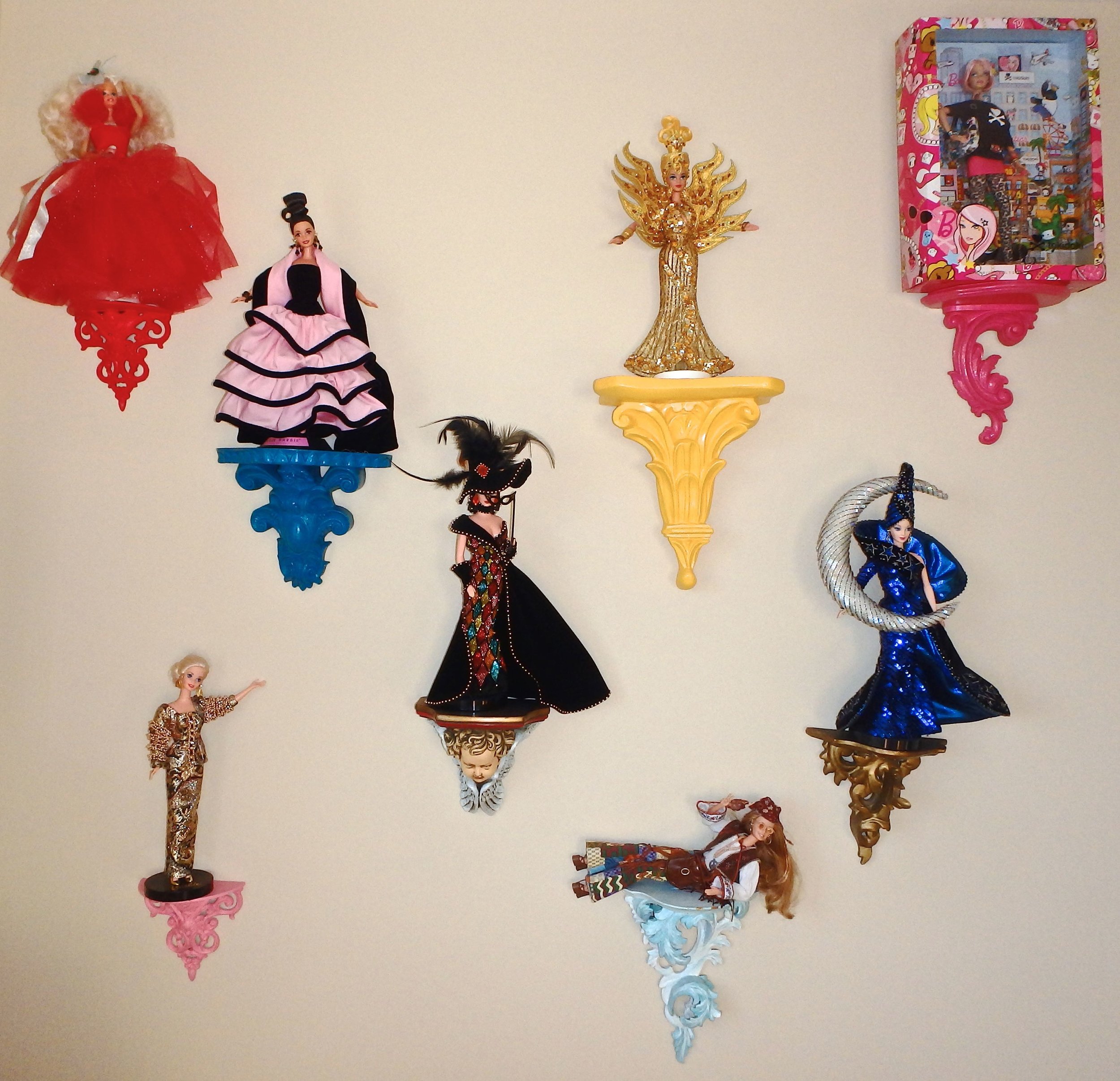 These are my Barbies. The one in the upper left corner is the doll I got when I was 4 for Christmas, that was the moment when I decided I wanted to grow up and be Barbie—a dream I’m sure many girls have, and one I was fortunate enough to have come true. I love these dolls.