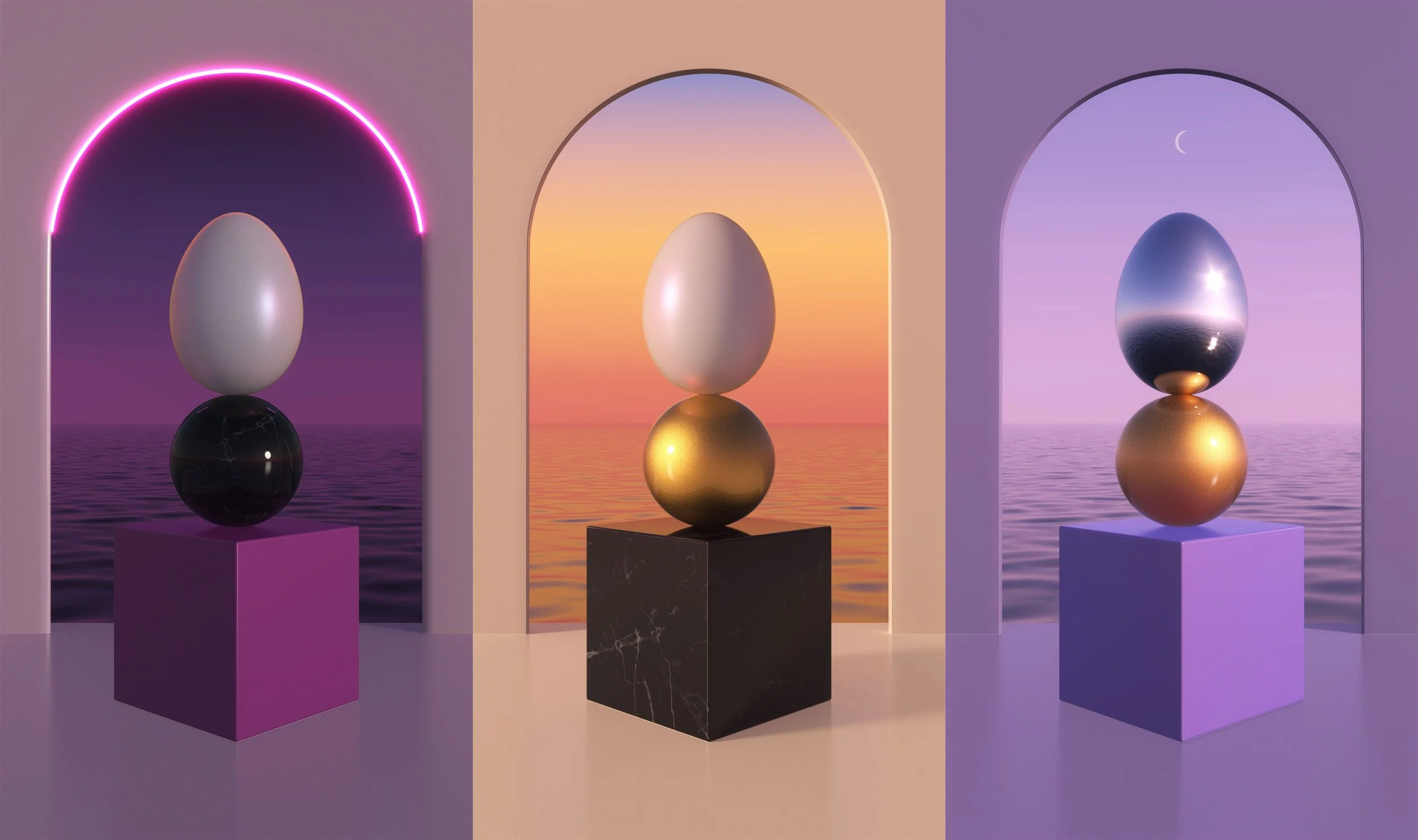 Pilar Zeta. Left to right: “Egg of Tomorrow”, “Egg of Dusk”, and “Egg of Dawn”