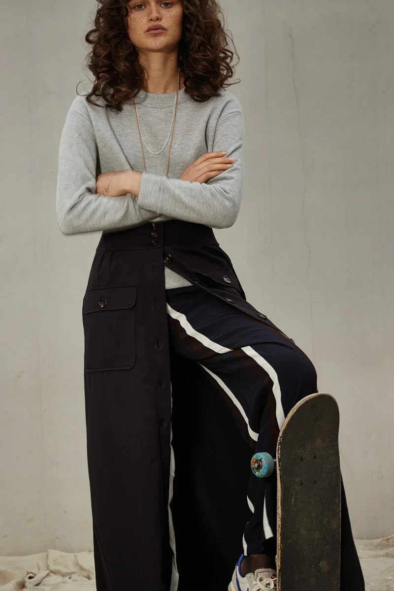 Sweatshirt and Striped wide leg trousers by **Topshop**, denim Maxi skirt with button front by **Chloé**, and Sneakers by **Nike**.