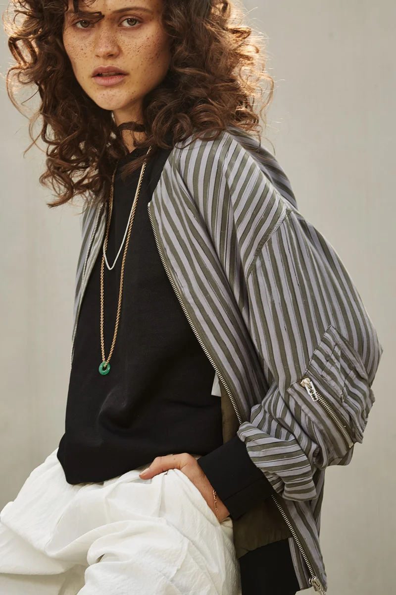 Striped bomber, top, and crinkled crêpe culottes by **McQ** **Alexander** **McQueen**.
