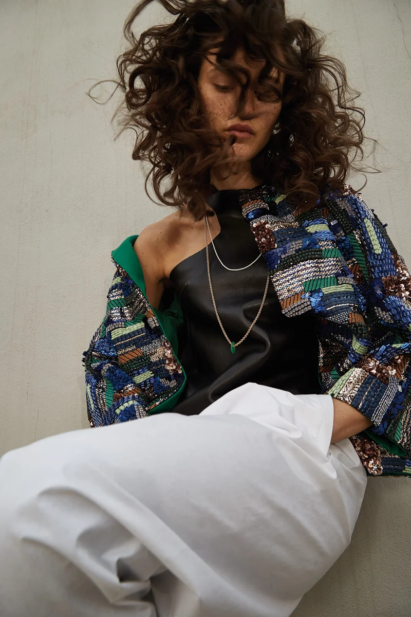 Sequined jacket and leather top by **DSquared2** and Trousers by **3.1 Phillip Lim**.
