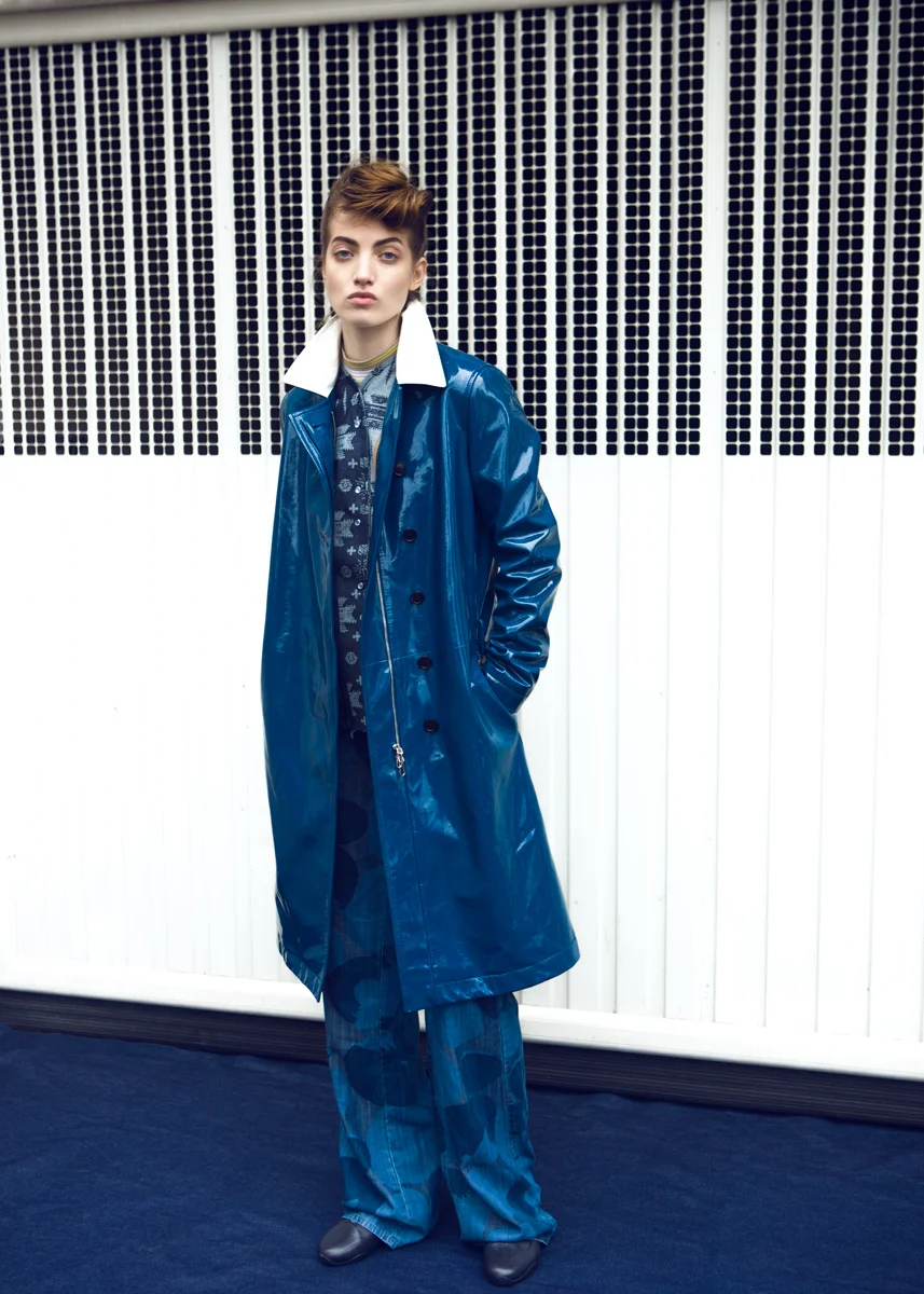 Patent leather coat and Shoes by **Dior**, Shirt by **Kove**, and denim trousers by **Armani** **Jeans**.