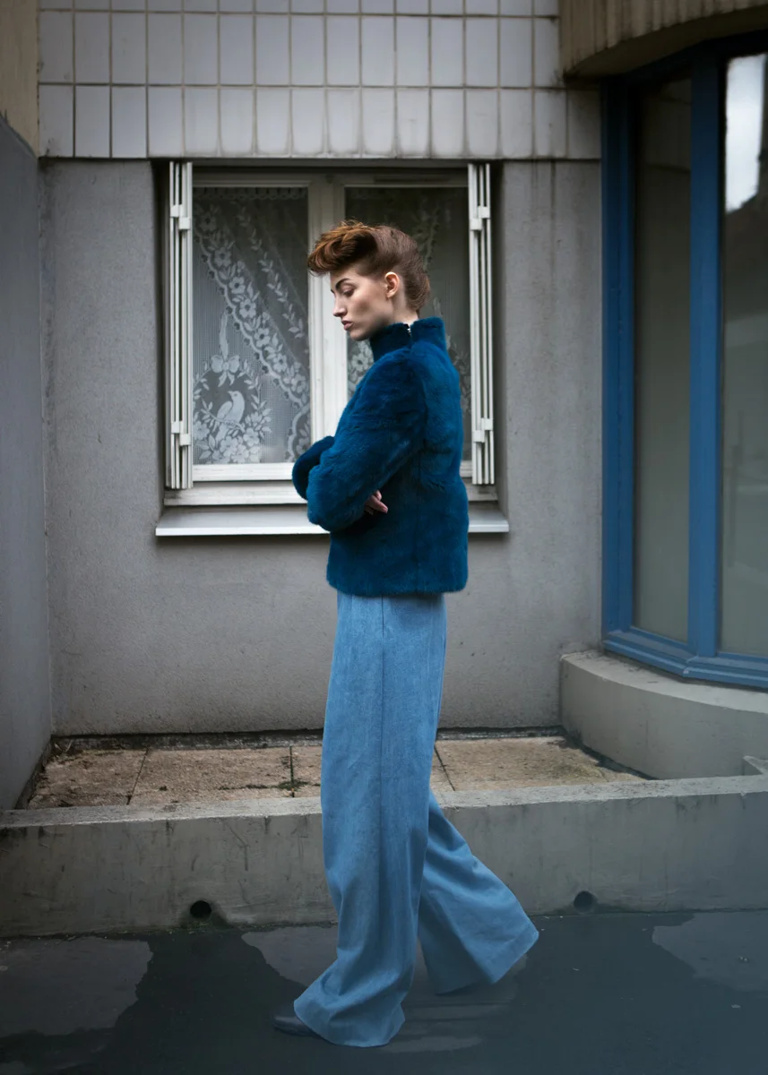 Fur Top by **Hermès**, denim Overalls by **Didit** **Edizioni**, and Shoes by **Dior**.