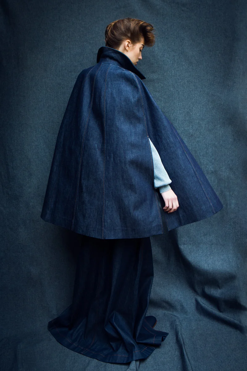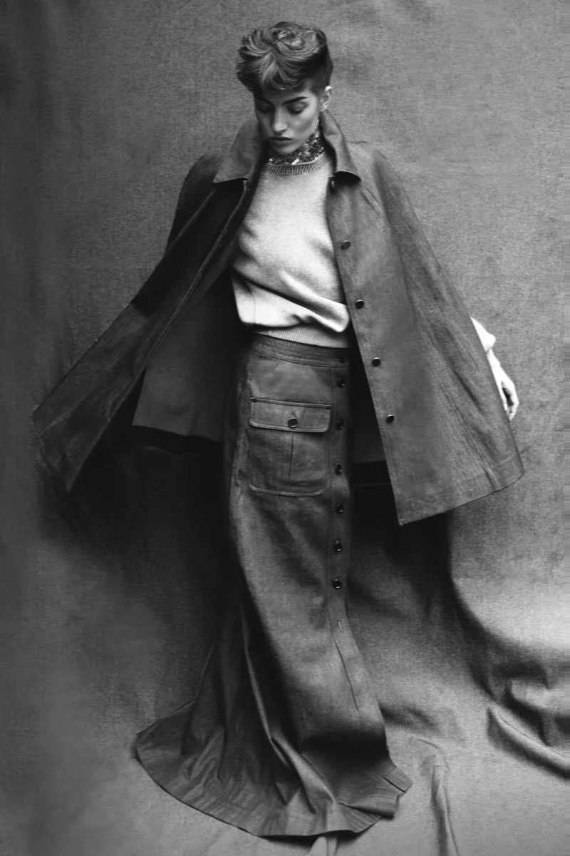 Denim Cape by **Vanessa** **Seward**, crewneck Sweater and denim button-front maxi Skirt by **Chloé**, and embroidered ‘trompe l’oeil’ sequin top by **Dior**.
