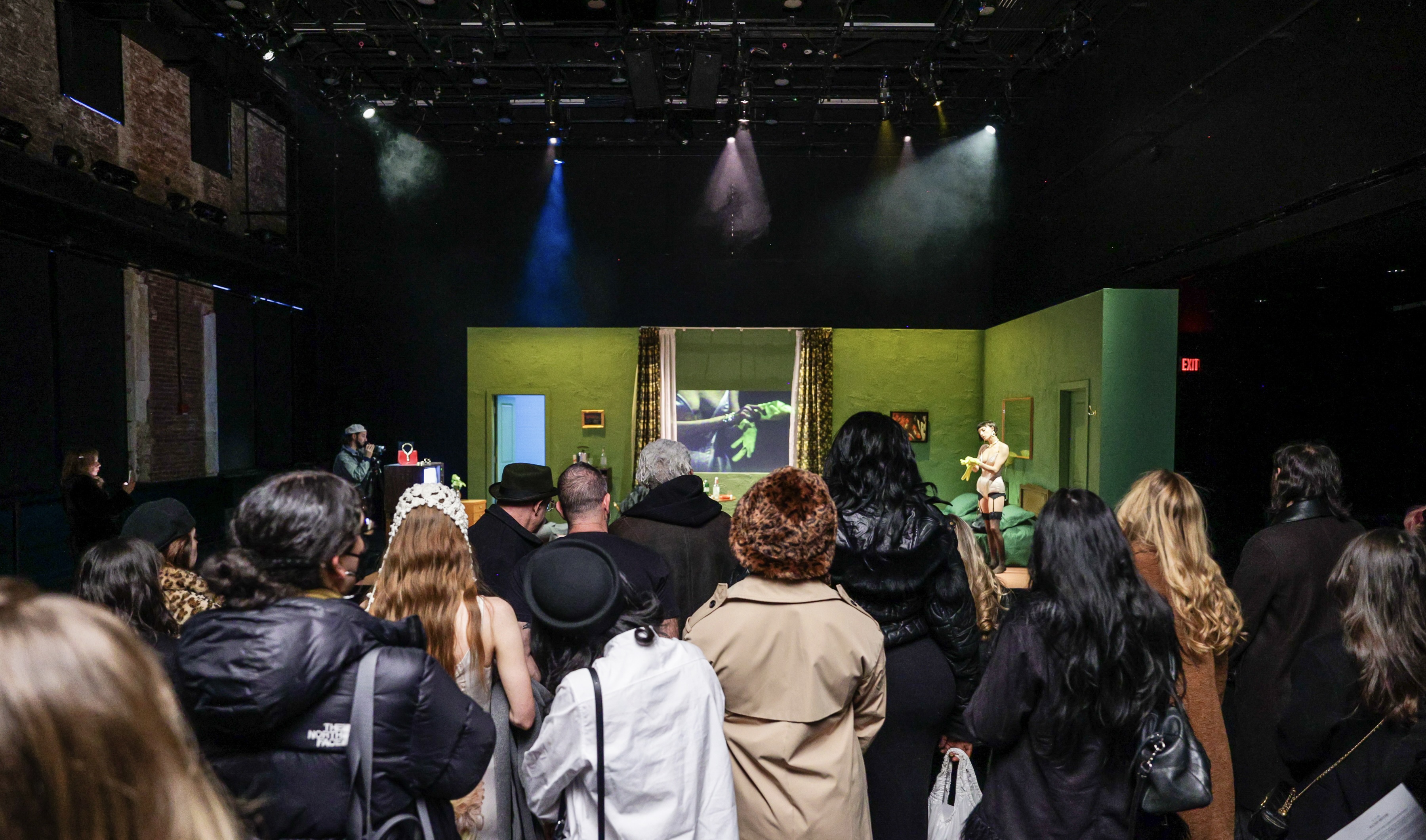 At first, viewers are taken through an evidence viewing room where Bittar highlights her timeless and carefully crafted pieces in her collection, all marked with evidence cards. Throughout the collection, Bittar celebrates strength through noir and glamour. 14k gold-plated snake details wrap around leather clutches. Art Deco-inspired crystals, spiral shapes, and handcrafted liquid Lucite pair with gold and sleek finishes to add depth and shine. Viewers are then led into a theater staged as a grimy hotel room, where a live reenactment of The Sexecutions of Amanda Gates unfolds. The audience encounters the killer in the middle of a seduction before everything turns deadly.