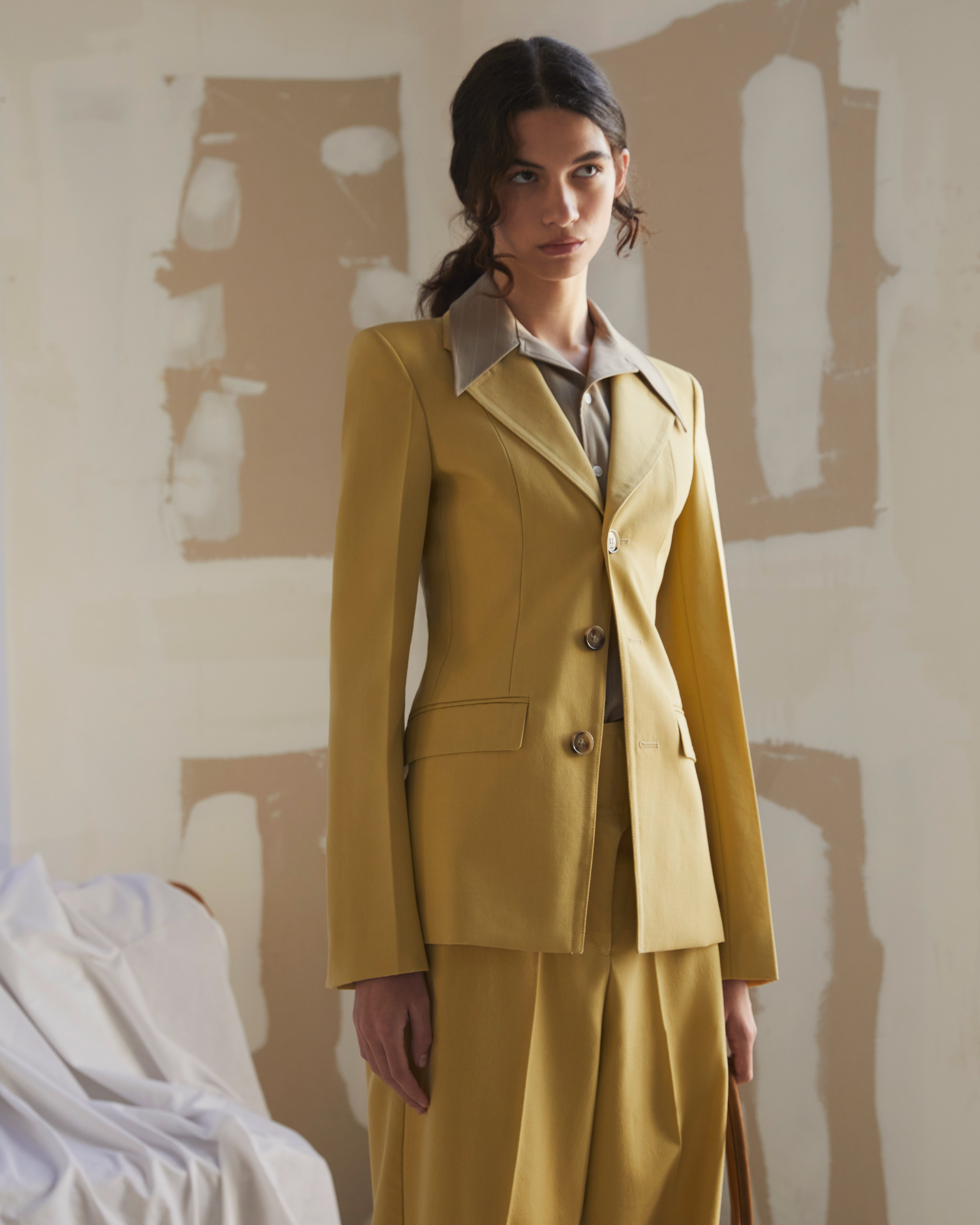 Founder and creative director Alexandre Mattiussi was inspired by real life when creating this collection–natural but lush textures of wool canvas lace, knit and silk, as well as a joyous color palette. Matcha greens and pastel yellow skirts come together with tailored and loosely fitted jackets to create an air of tranquility. With raw denim and bold leather, this collection moves between traditional and fluid fits. Each look is multi-dimensional, with stripe motifs and peppered beige and off-white ones uniting the collection. The joy from this collection is contagious, extending to the leather goods. The Mimi bag goes mini and the Carrousel bag takes on the new neutral but playful palette.