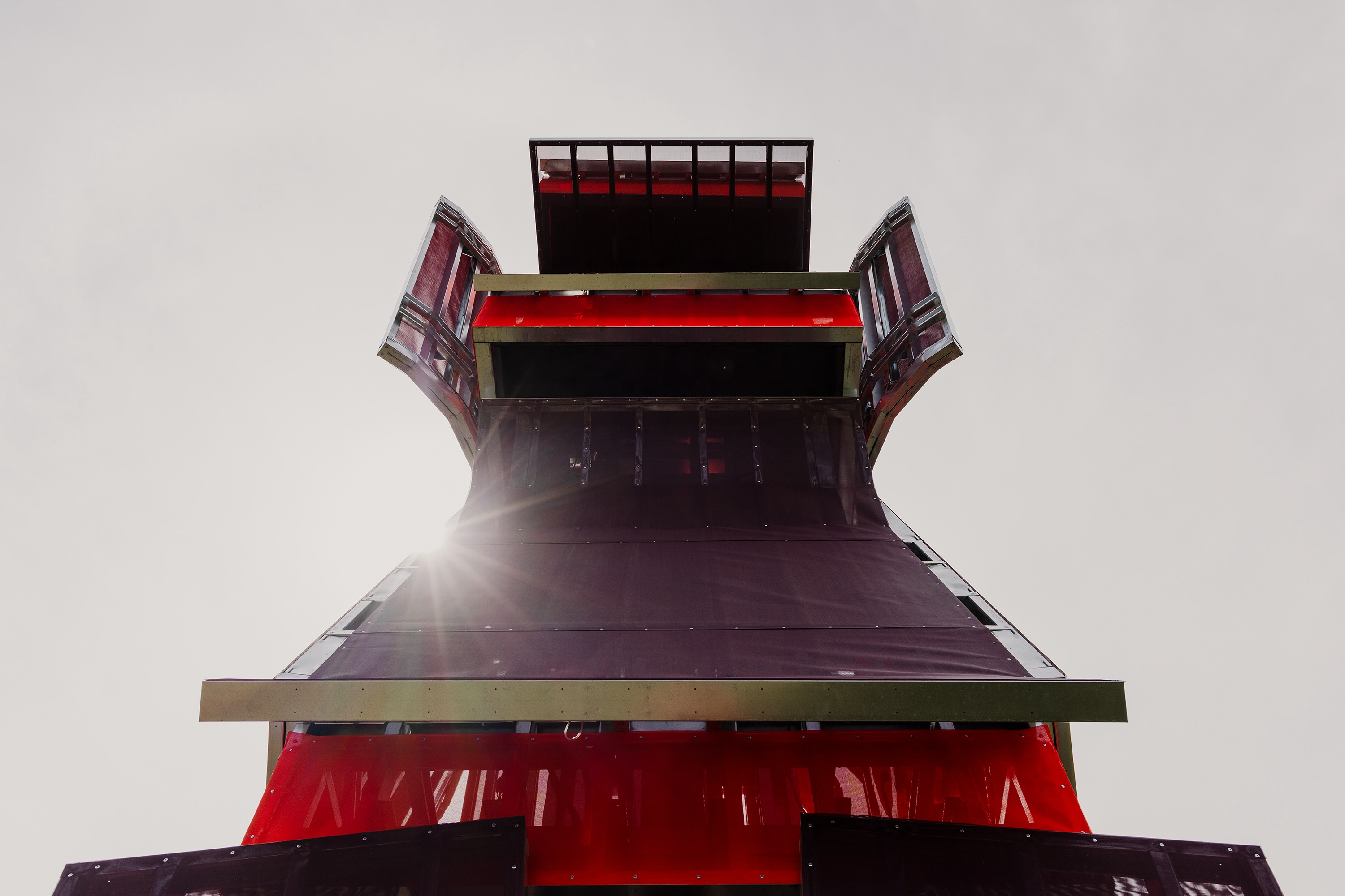 The LADG, the practice of Ben Freyinger and Andrew Holder, is known for merging historical ideas with contemporary urban challenges. “Visage Brut” is a soaring seel totem composed of modular boxes, with each one folded, rolled, or warped to the edge of structural integrity. Born from an experimental collaboration with software-assisted steel fabricator Stud-IO Construction, the tower transforms the industrial material into something more figurative.