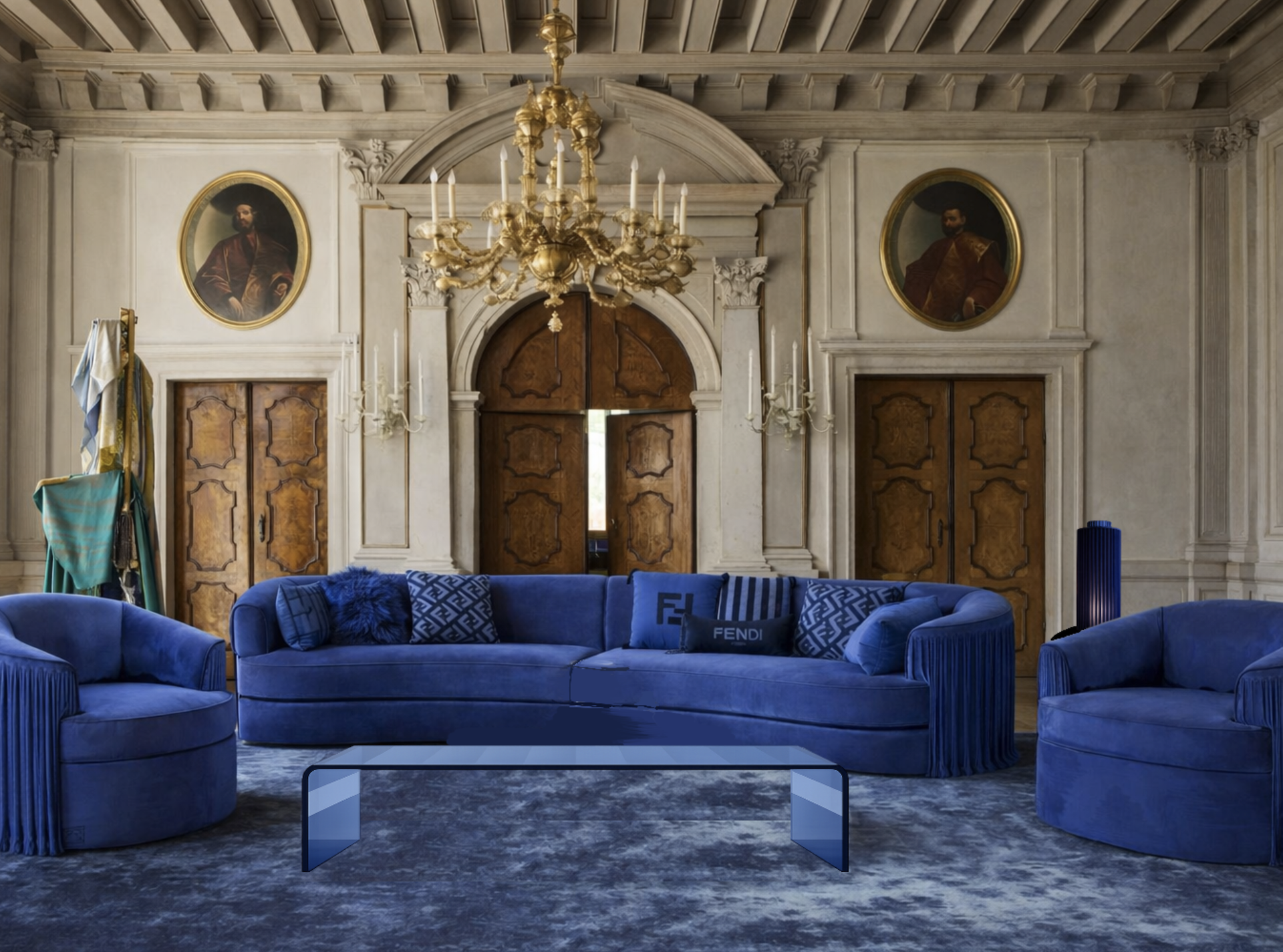 VELARE CAPSULE COLLECTION by Mahra Mustafa allows heritage not only to be seen, but also experienced. Curved surfaces, fringe, and glass unite in a deep blue palette to create a suite of chairs, a sofa, a table, and a rug. The collection evokes the Roman dusk, where still objects reflect light and conjure a sense of movement.