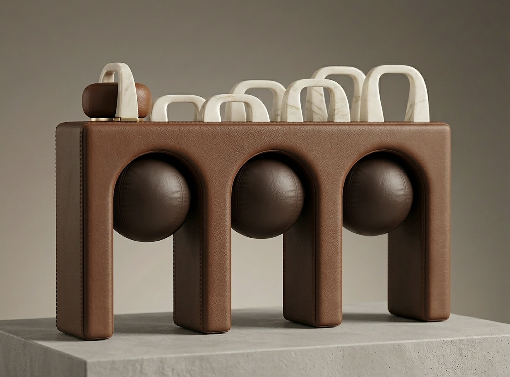 FENDI FITNESS KIT by Muskaan Agarwal and Matilde Brambilla integrates wellness into the luxury home. Merging function with sculptural design, the project draws from Roman architecture and FENDI’s house codes. The bench features brown leather padding, arched cutouts, and a series of marble looped handles grazing along the top. Made to be intentionally visible, it stands as both functional and sculptural, an emotionally resonant piece.