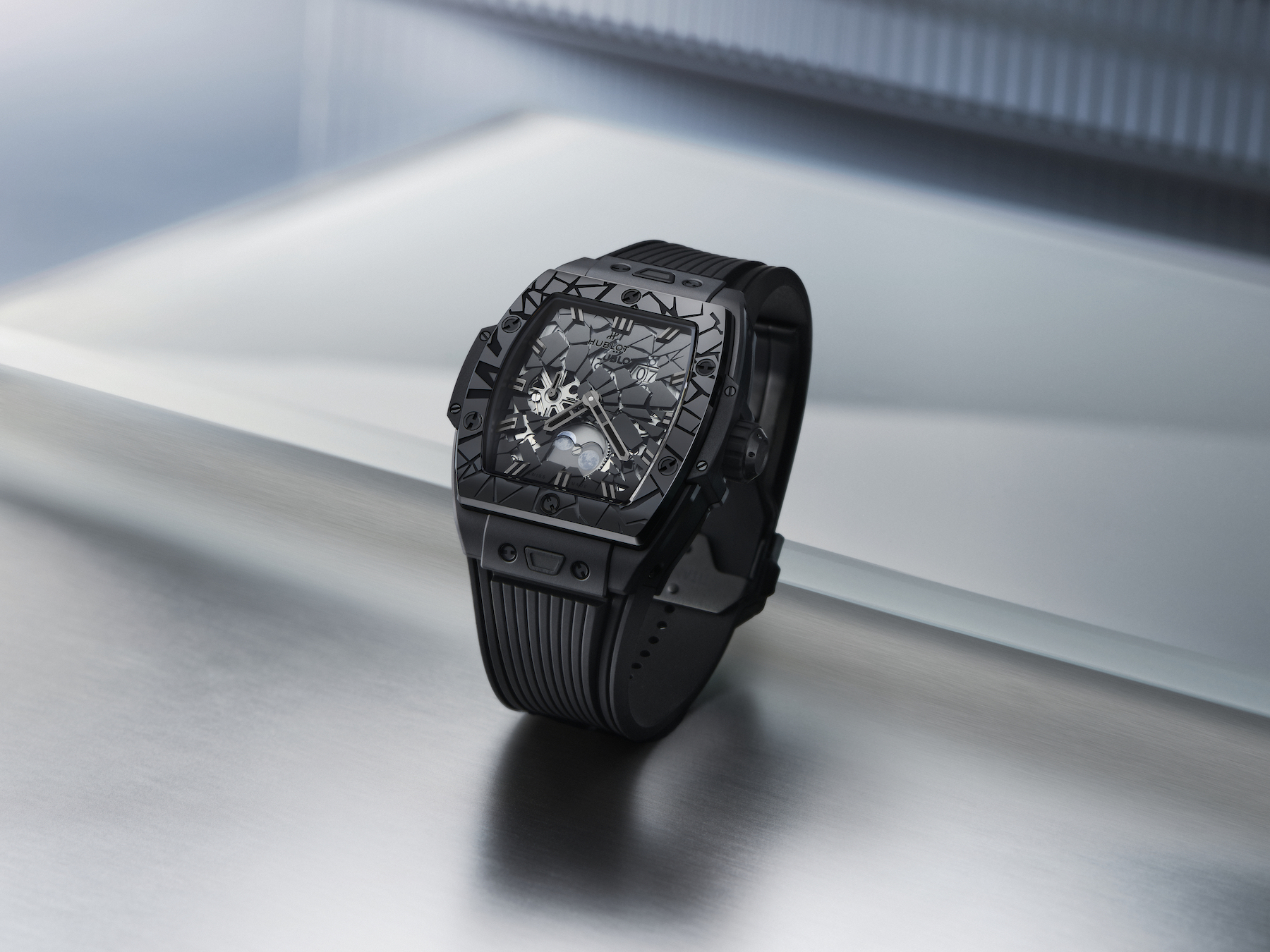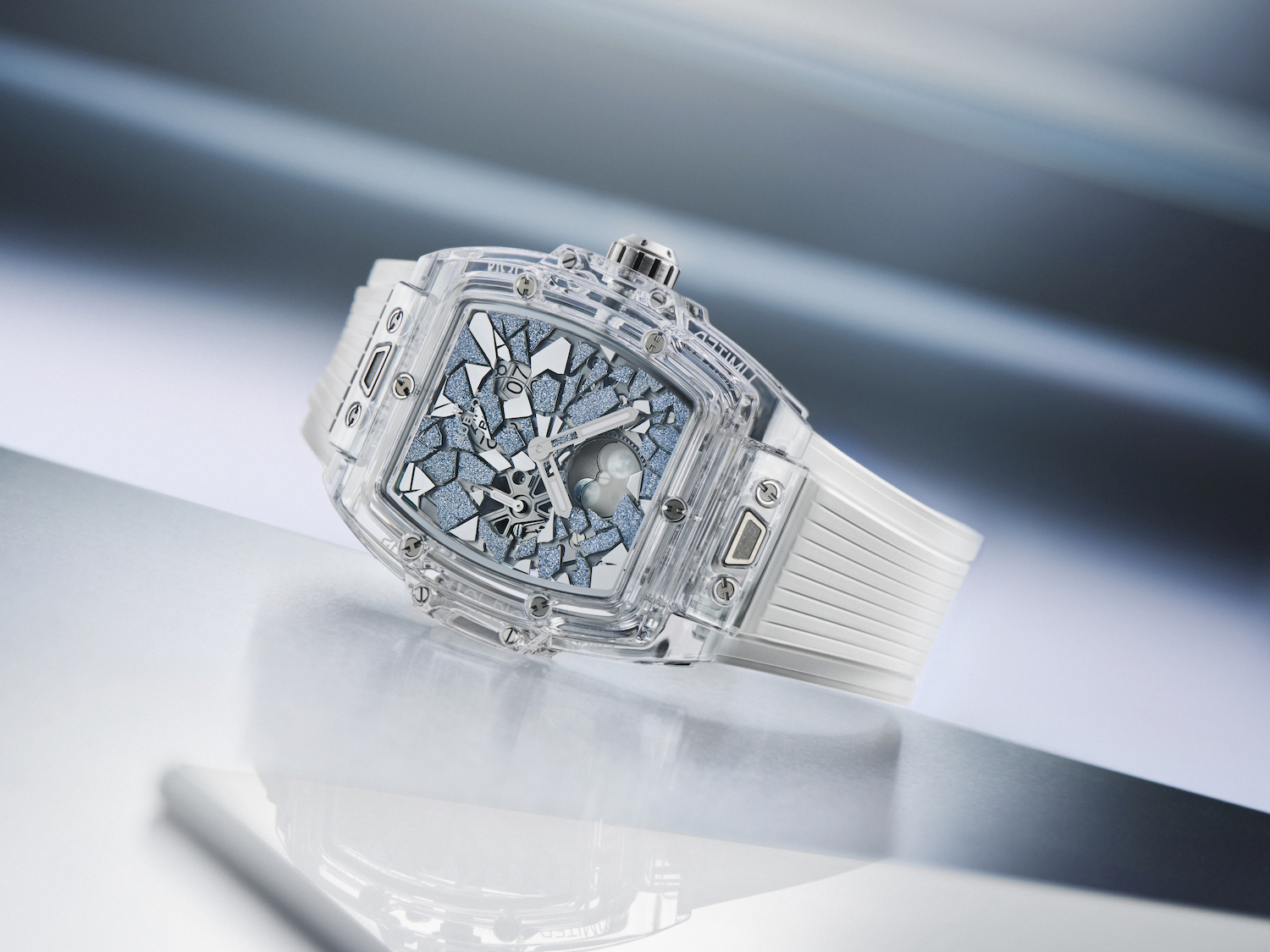 Within that framework, the Spirit of Big Bang "Impact" editions—a specialized offshoot of the tonneau-shaped Spirit collection—push the furthest technically, translating the fragmented “Impact” motif into a 42mm case where angular shards radiate from bezel to dial around a moonphase at six o’clock. For the first time, Hublot sets diamonds directly into sapphire, requiring laser-machined channels and individually adapted mounts for each stone within one of the hardest materials used in watchmaking.