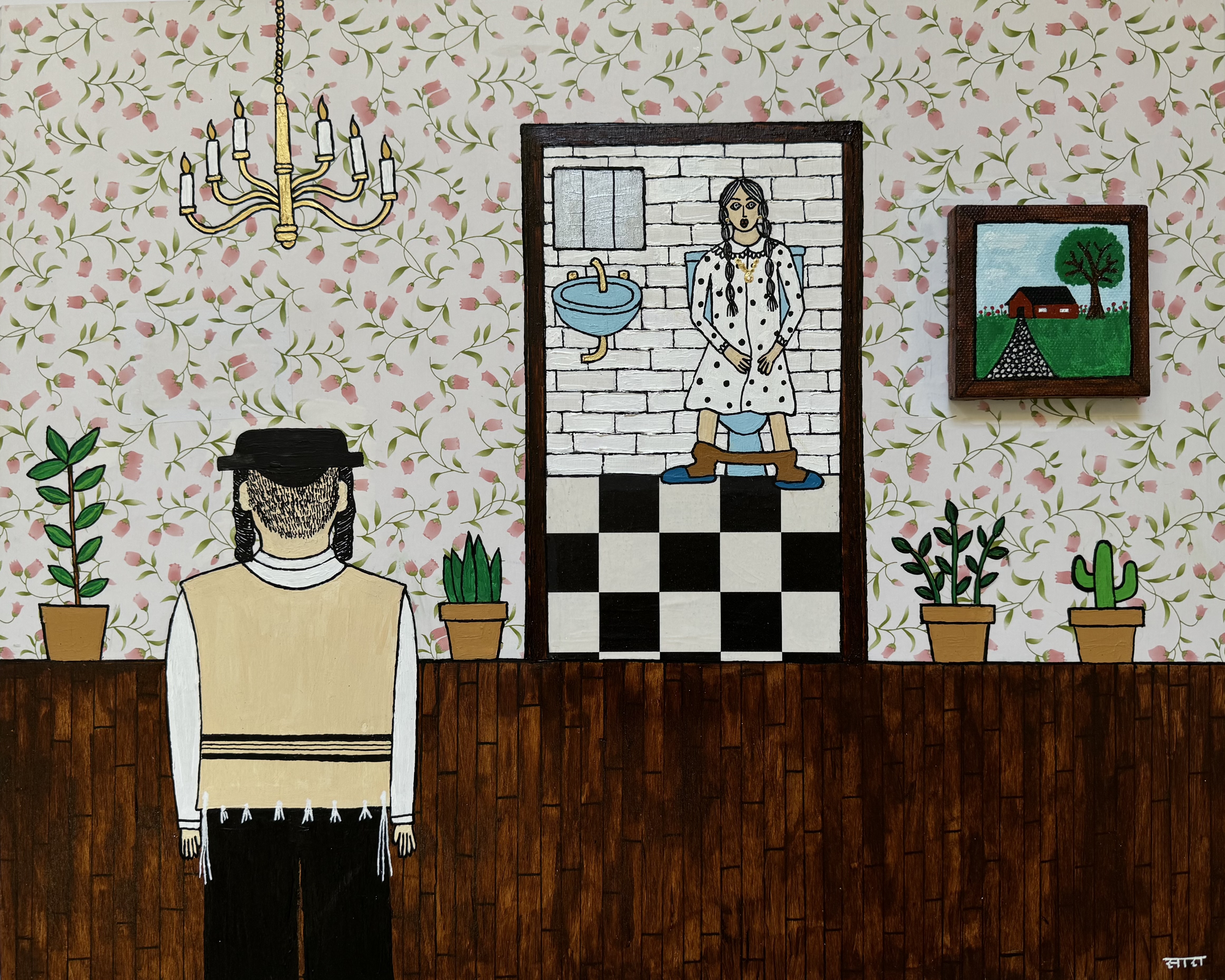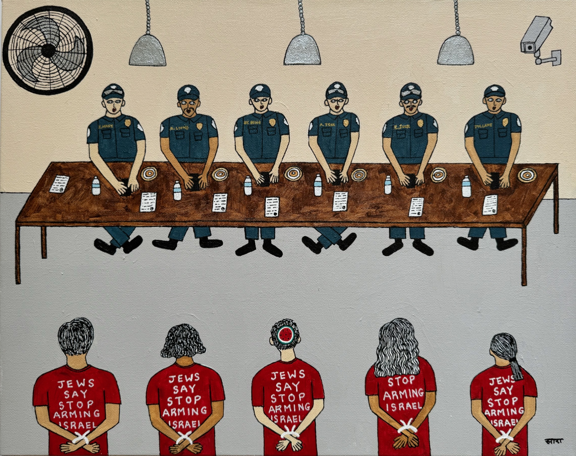 That tension in reflecting on personal religious history echoes in the works contributed by Sara Erenthal, a multimedia artist whose work has appeared across North America, Europe, Asia and Central America. Erenthal’s painting “The Holy Spirit” (2024) confronts her upbringing in an ultra-Orthodox Jewish community in Brooklyn. At seventeen, Erenthal escaped an abusive home to avoid an arranged marriage and spent a decade working odd jobs, eventually traveling the world and developing a daily art practice that began with the personal and over time shifted towards overt political messaging. “No Supper” (2024), Erenthal’s second contributed work, was inspired by a seven-hour detention following an action in Washington DC with Jewish Voice for Peace, the world’s largest Jewish Palestine solidarity organization. The cops processing the arrests, she observed, had nothing to do but sit at a long table, scrolling their phones, a scene that reminded her of the Last Supper. Erenthal’s practice, she’s said, functions as therapy to process a difficult past, and to empower movements for human rights.