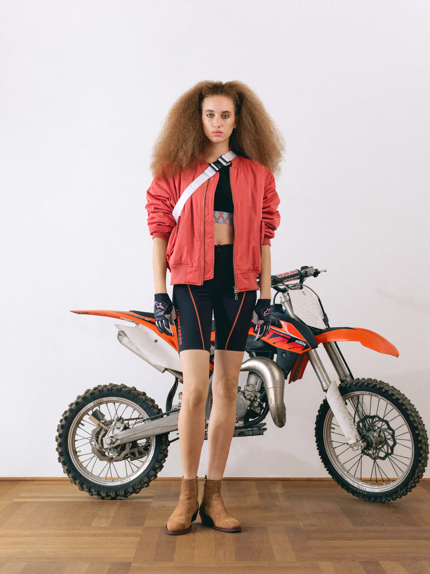 The SS24 collection is a reflection of the updated identity that Lewty intended to curate for J.Lindeberg. Drawing from staples in motocross apparel like biker shorts, leather jackets, and gradient lens goggles, Lewty mediates the conversation between contrasts: the urbanite and the remote islander; the biker and the pedestrian; the high fashion and the casual. Bold primary colors pop against neutrals. Worlds converge and strike a balance.