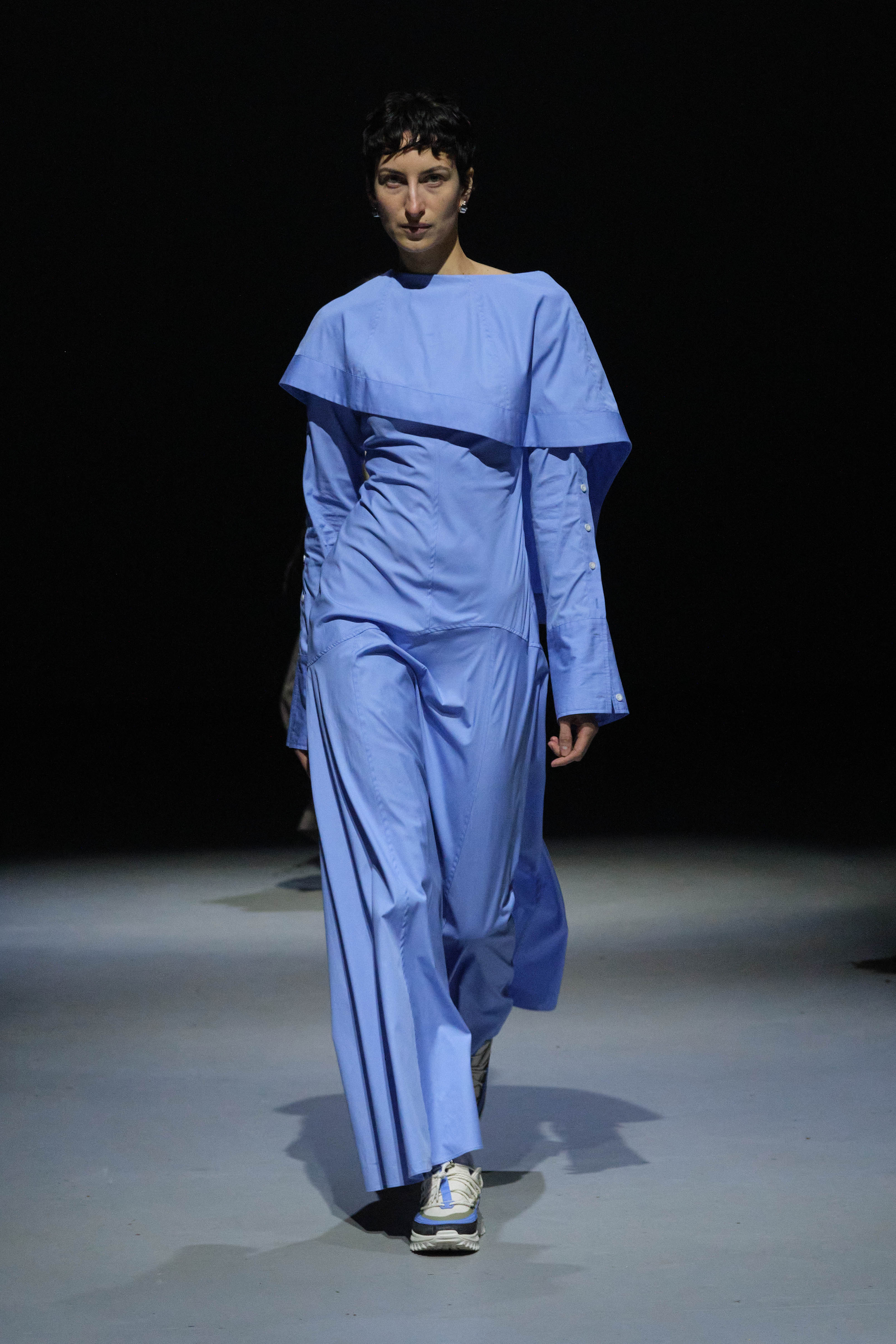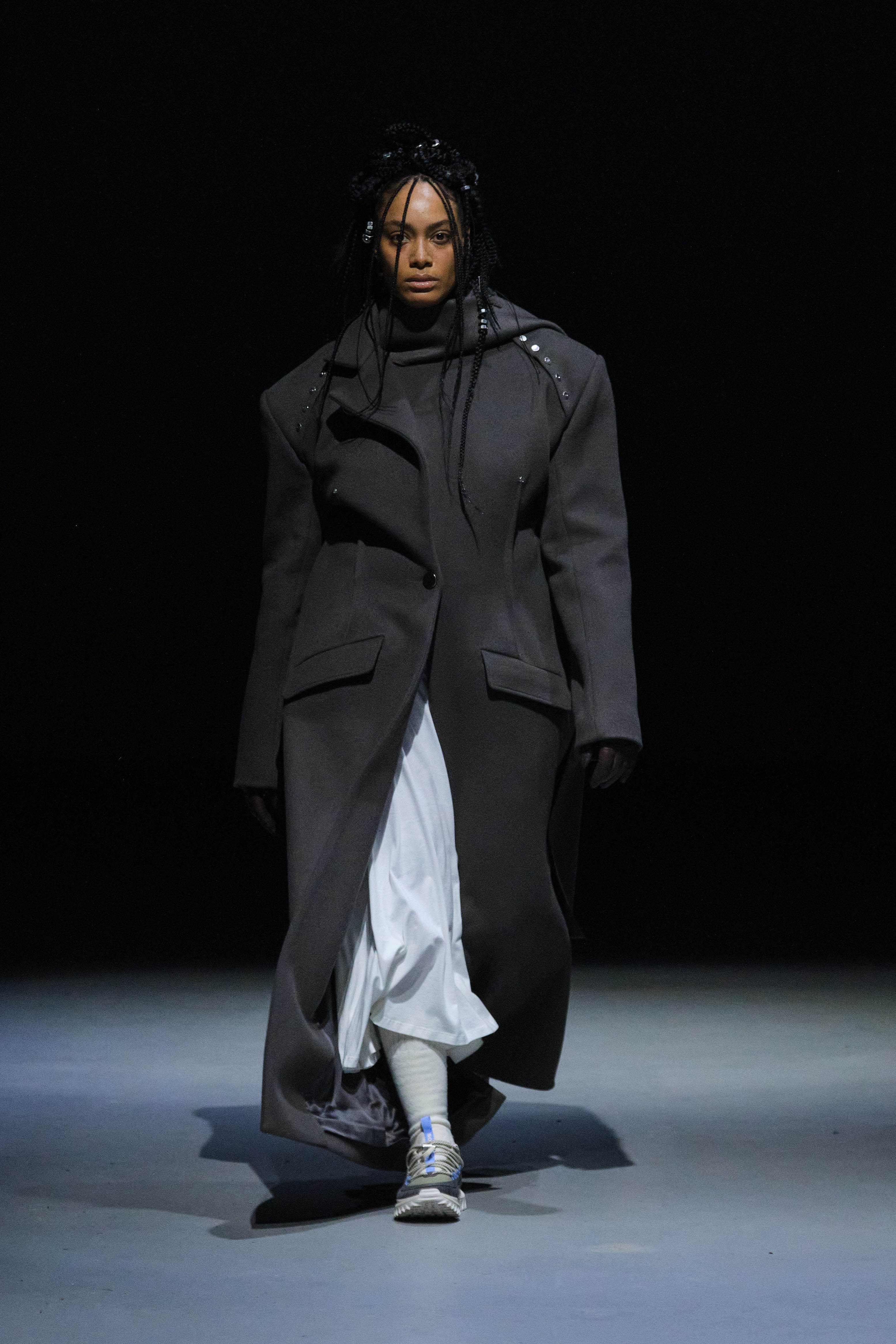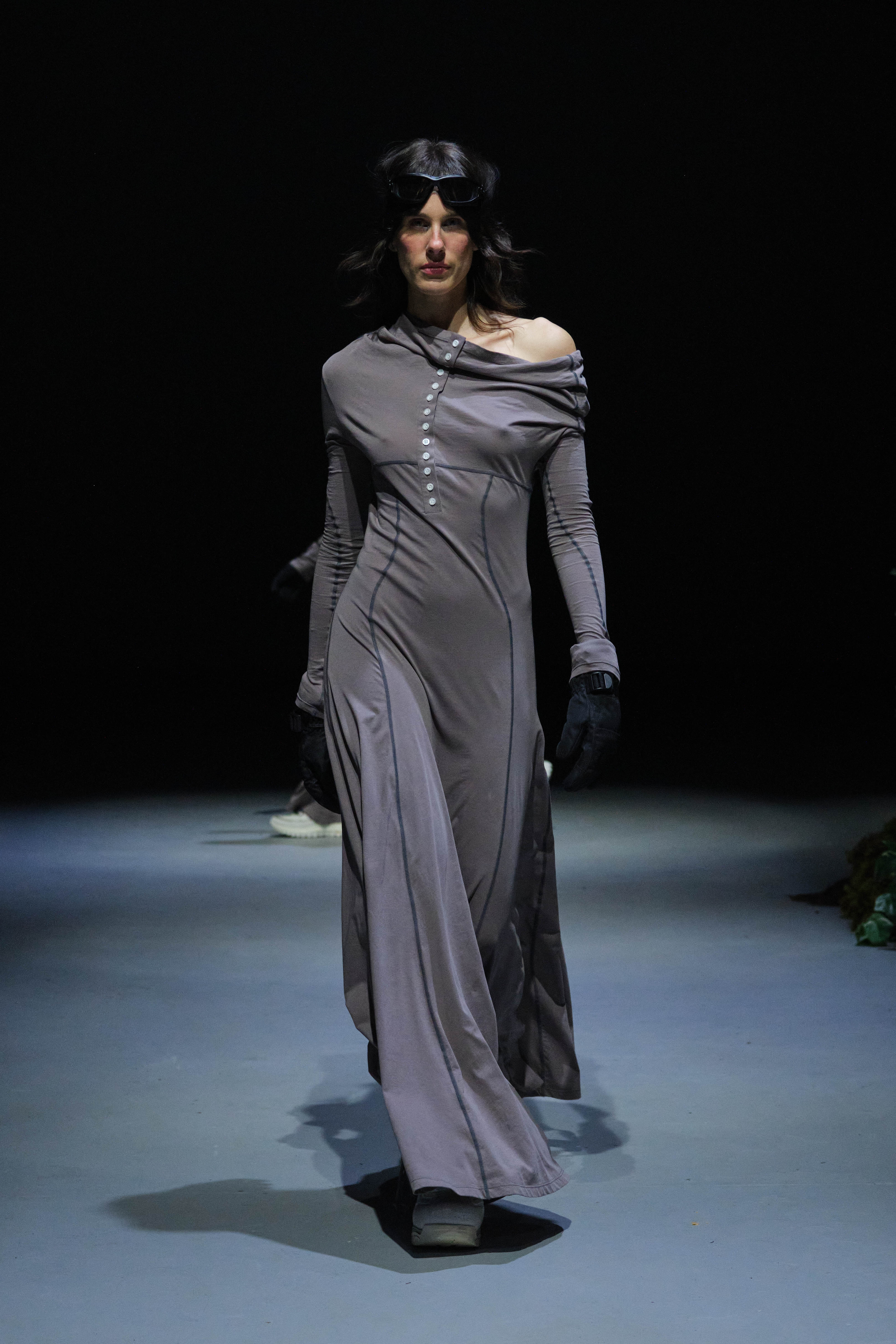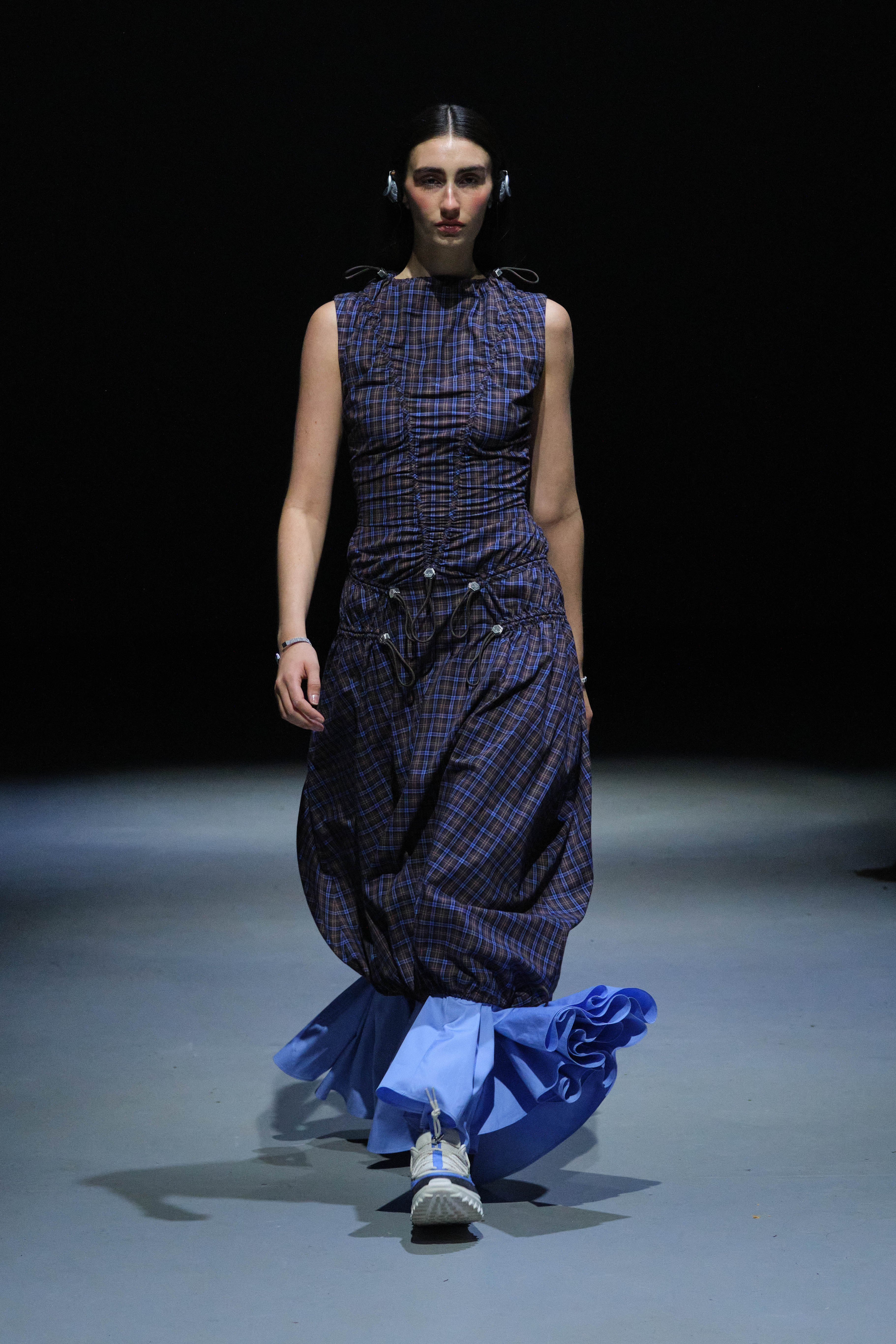 Jane Wade’s THE SUMMIT Fall Winter 2026 collection plops the predictable officewear from corporate HQs into the uncertain yet demanding nature of the outdoors. It imagines office workers hiking mountains, rafting white water, and camping instead of lounging in meetings, filing papers, and presenting power points. Cinched dresses and multi-buttoned jackets establish the collection’s vision of harmony between function and lifestyle.