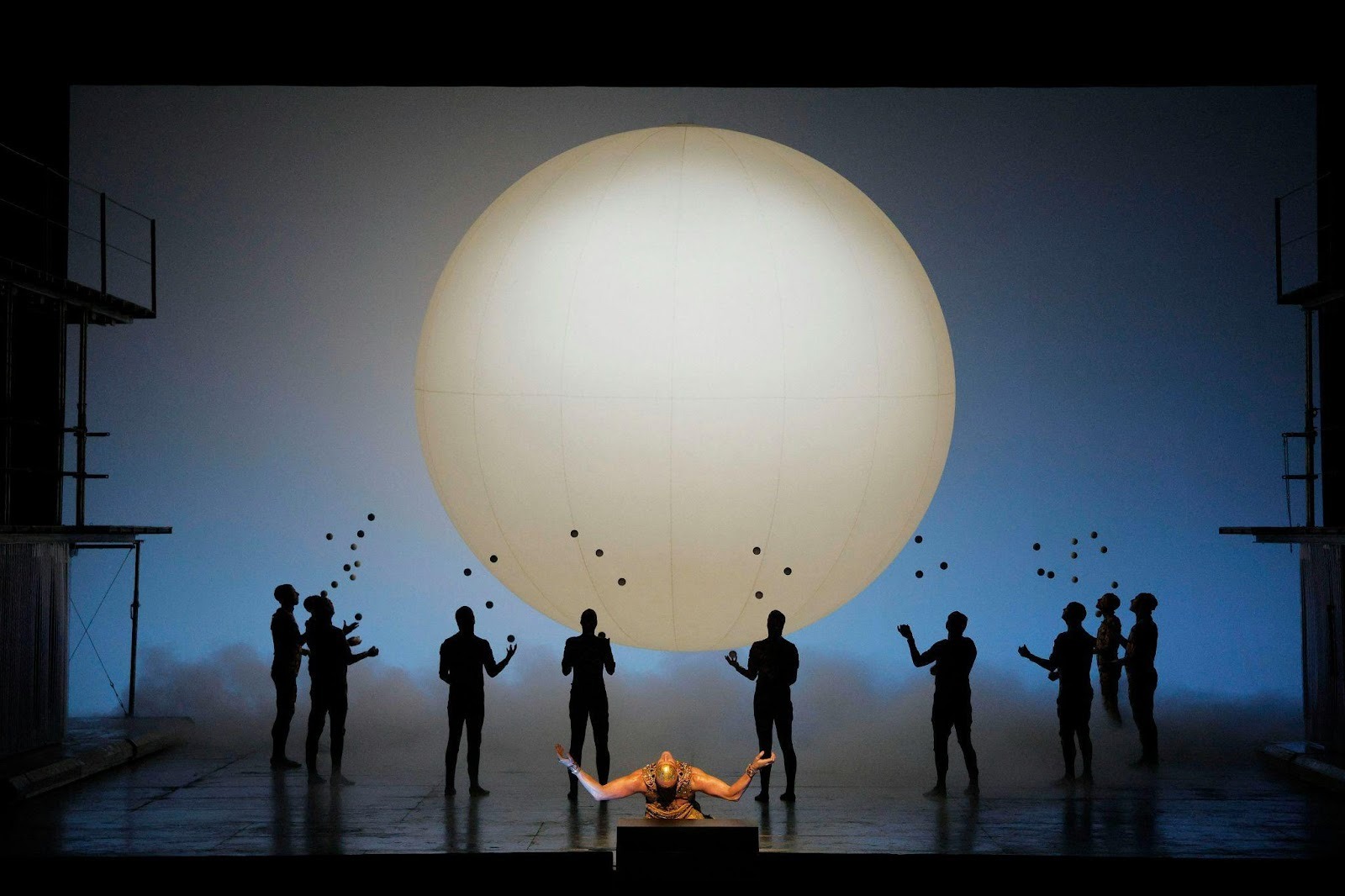 Another important element within Akhnaten’s storytelling is the scenic and costume designs. Scenic designer Tom Pye and costume designer Kevin Pollard deliver a masterclass in visual storytelling. The story flows through a series of transitions out of polytheism, towards monotheism, then back again. In the beginning we see a stage setup consisting of three tiers. At the very top are the Egyptian gods, at the center are the priests, and at the bottom are men. It harkens back to similar paintings found in Egypt, with multiple tiers having dynamic scenes play out upon them. With a fast tempo and choral arrangement, juggling gods, and opulent costumes, extravagance is the defining theme for the old world of polytheism on this stage.
