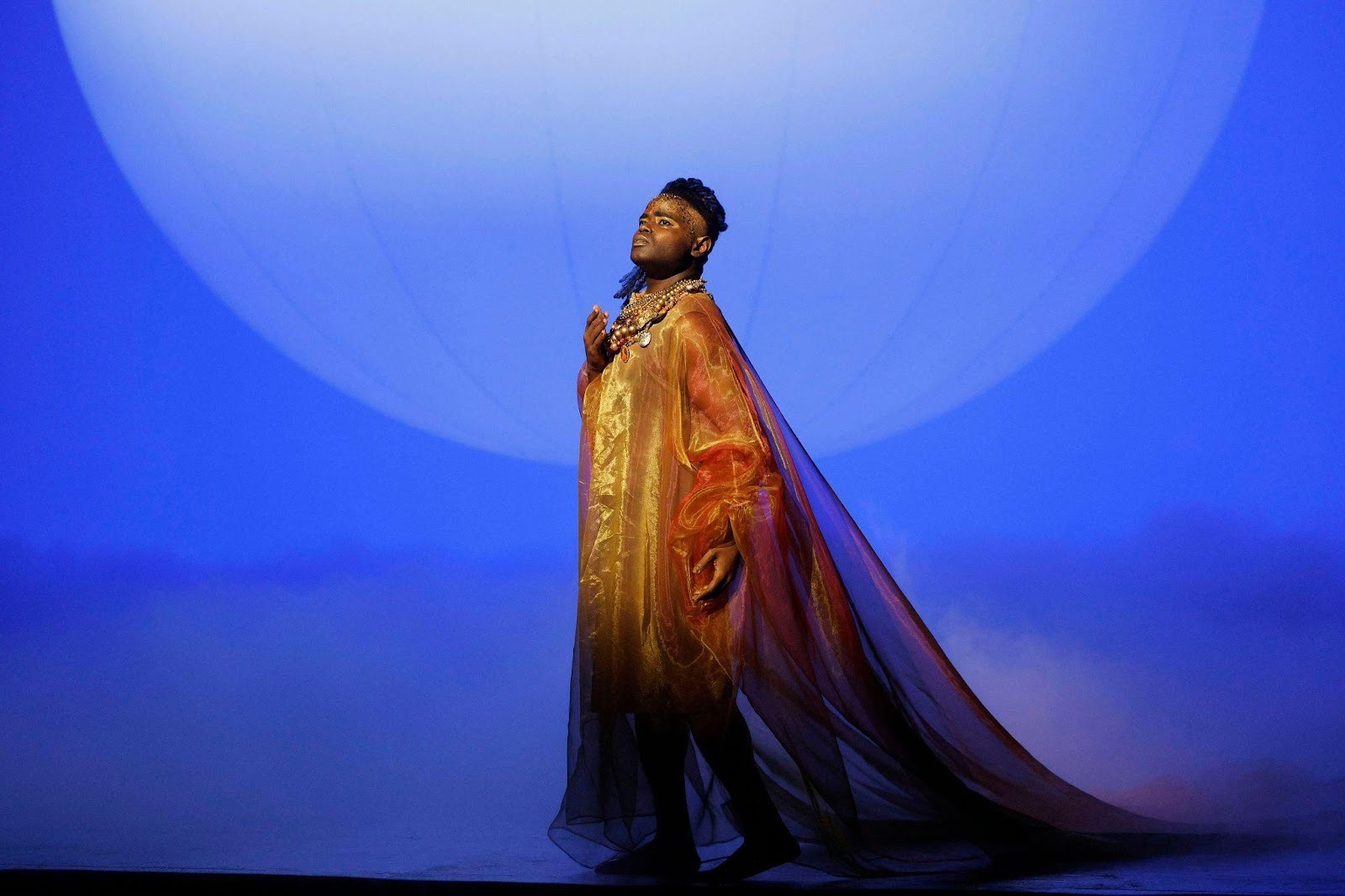 Once Akhnaten establishes his new religion, the performance draws back. Glass’ much simpler score and McDermott’s minimal direction on stage parallel the shift to monotheism from polytheism. A big sun, the Aten, engulfs the stage with minimal other ornamentation. Akhnaten and Nefertiti in turn wear simpler clothing. These choices help audiences intuit the enormity of Akhnaten’s decision, the complete upending of previously established ways and onto brand new horizons of spirituality. From an audience’s perspective, the experience is like that of the sublime, with a sense of awe that follows. Glass achieves this through an almost impressionistic style of biography, emphasizing feeling as the primary source that guides the story.