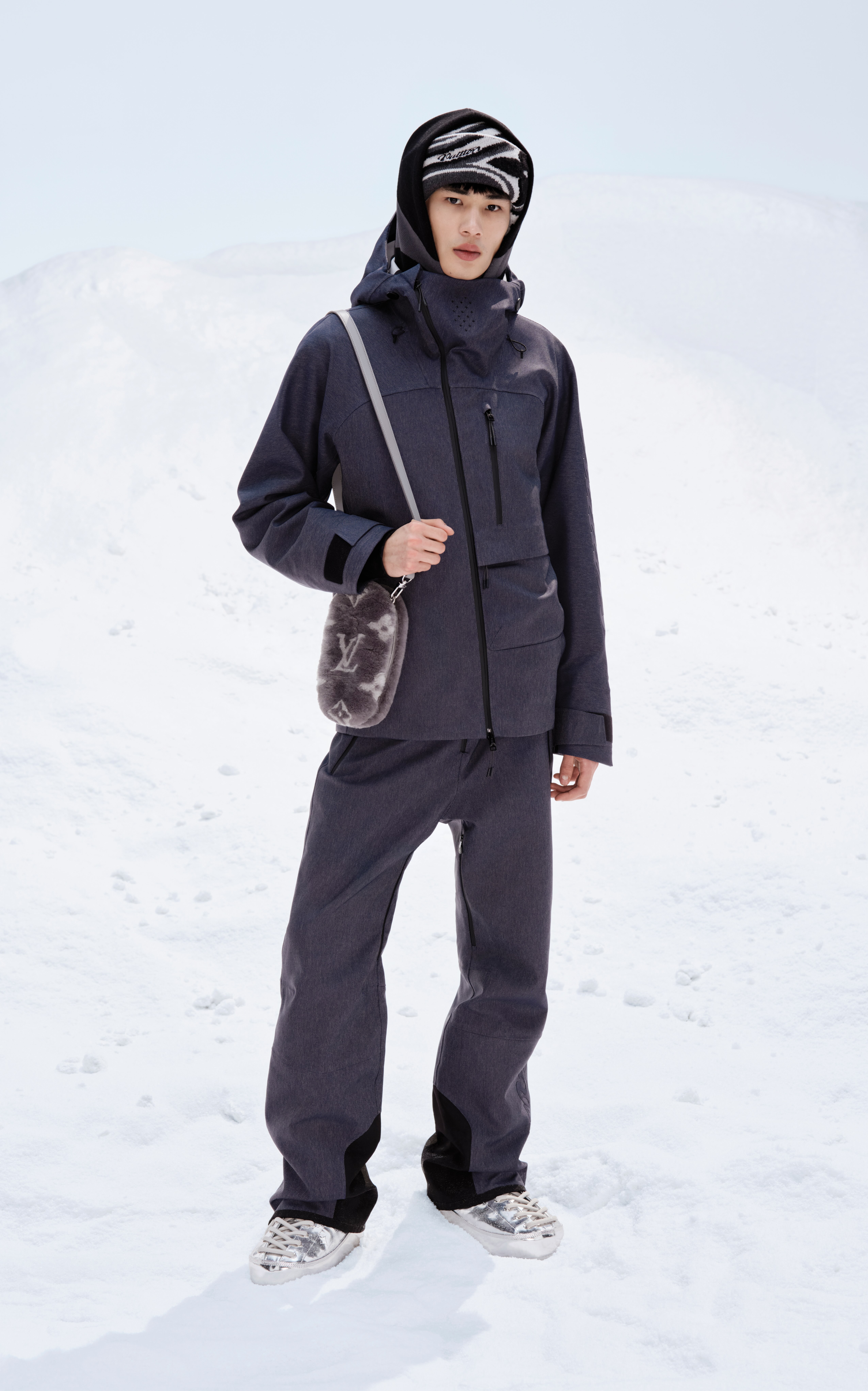 Constructed with waterproof and water-repellent materials, ventilation details, insulated phone compartments, and integrated BOA trouser systems, the collection’s foundation is made up of the latest ski technology. However, what separates this LV collection from other luxury skiwear is the way in which these revolutionary materials are presented–as casual, cozy, everyday garments. LV presents a corduroy jacket that meets the demands of the slopes, alongside a ski suit presenting as a luxurious Canadian tuxedo.