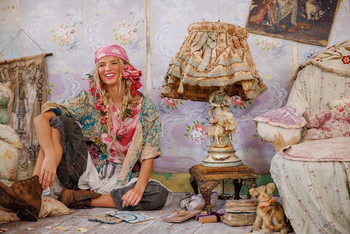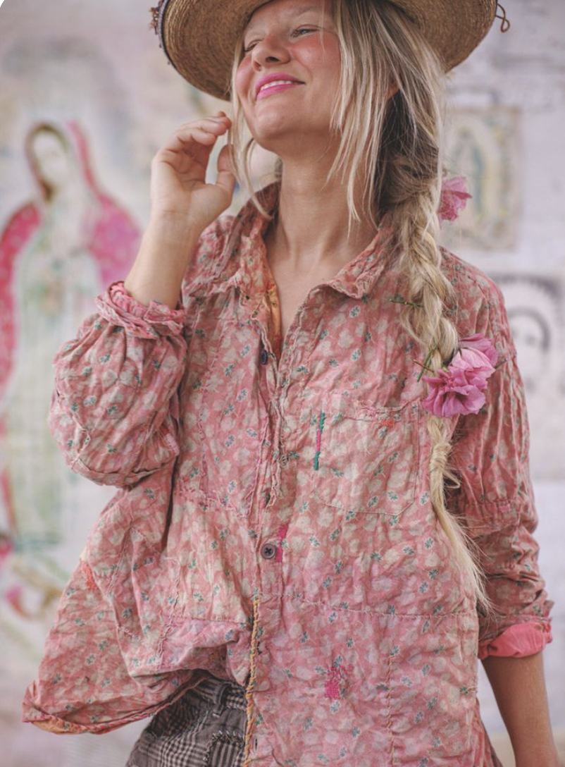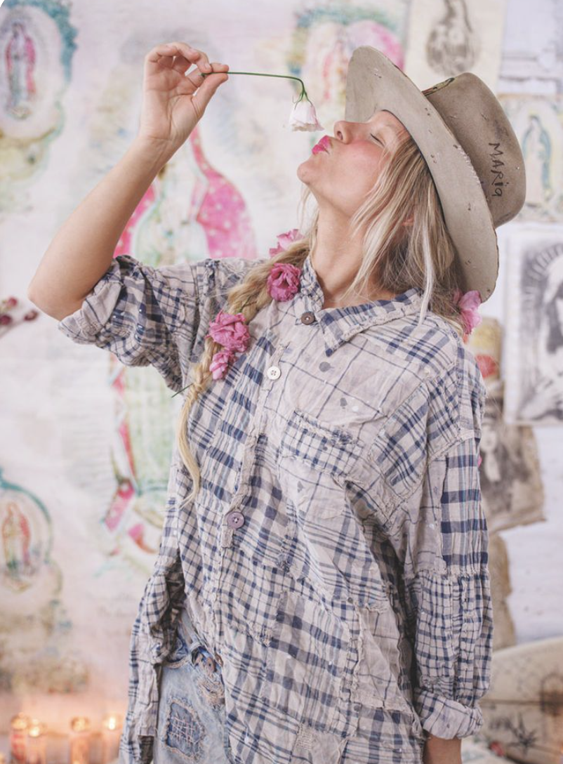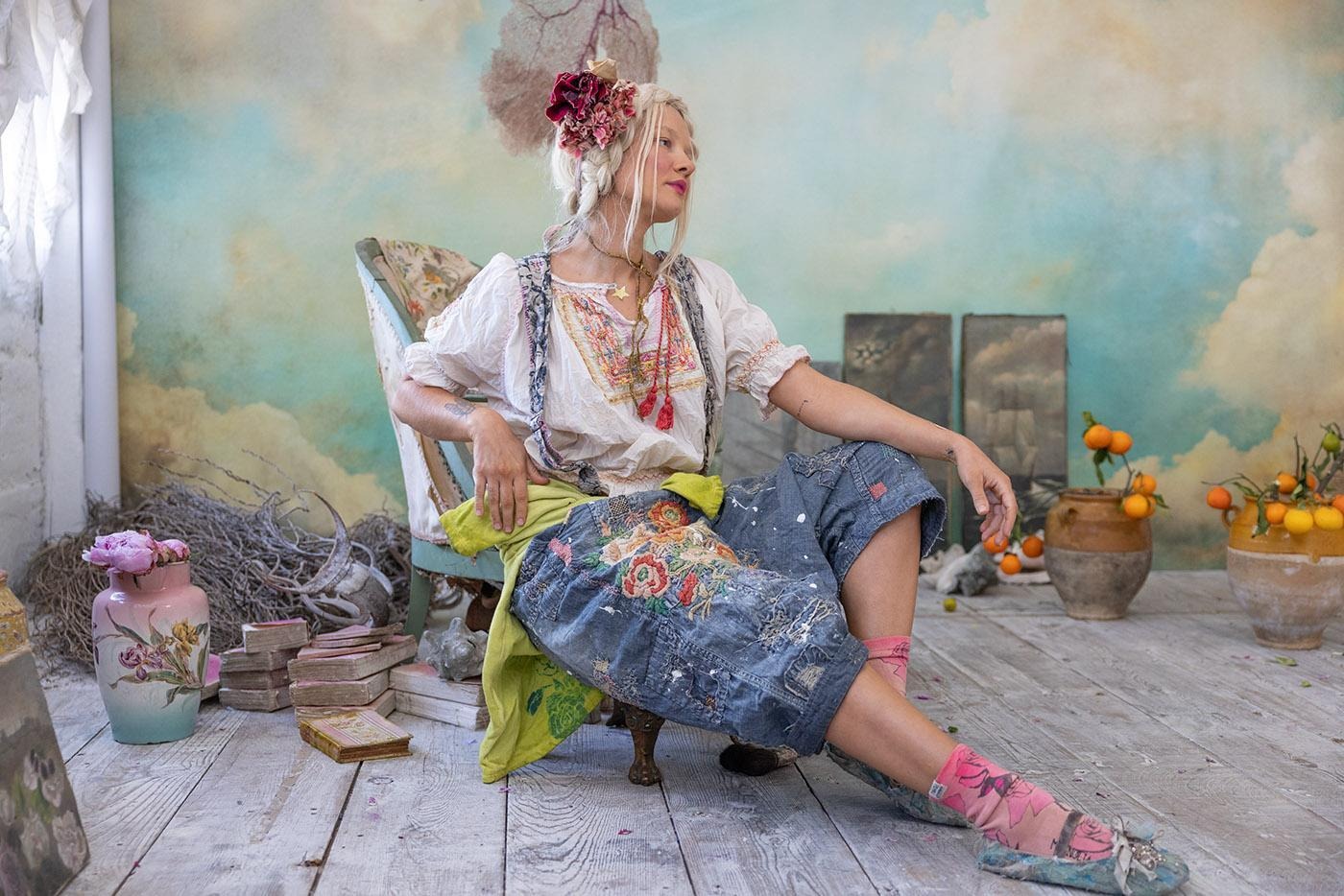 Magnolia Pearl’s clothes are not polished. They are deliberately distressed, patched, and paint-speckled. Each piece looks as if it has already lived a long life. In a market obsessed with freshness, that choice is radical. It says that time and wear can add value rather than strip it away.