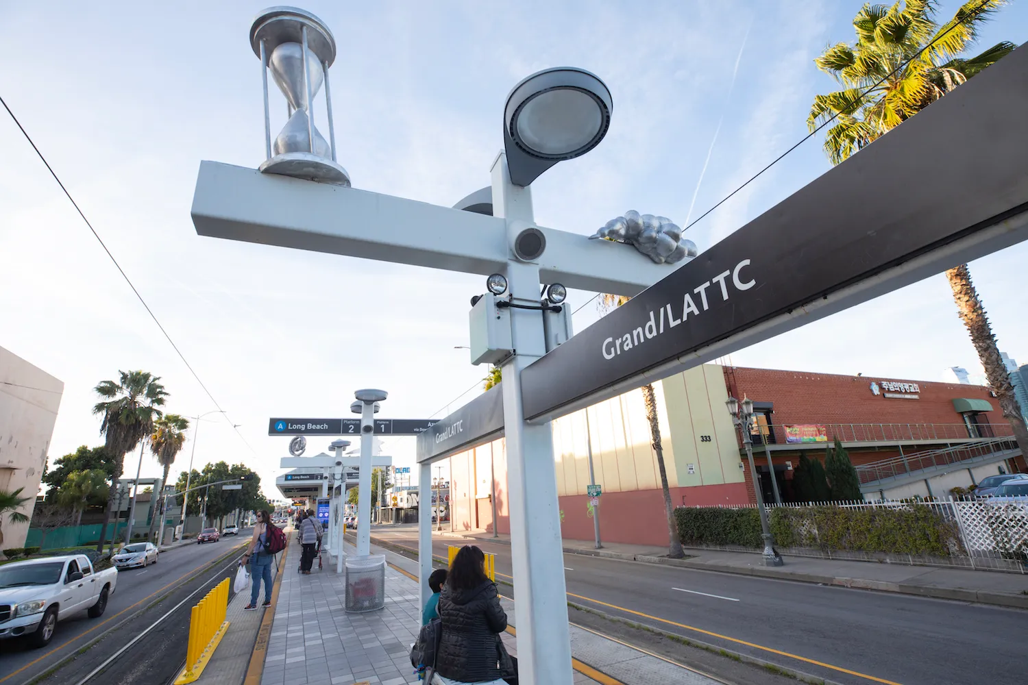 In downtown Los Angeles at the Grand/LATTC Metro Train Station, artist and sculptor Mark Lere presented his piece, “Who, What, Where?” to the public this past weekend. The reinstallation comes 20 years after the original, when the A Line first opened. Leres sculpture consists of a series of sandblasted texts including human figures and symbols that push forward the notion of travel as a parallel to where audiences are going and coming from.