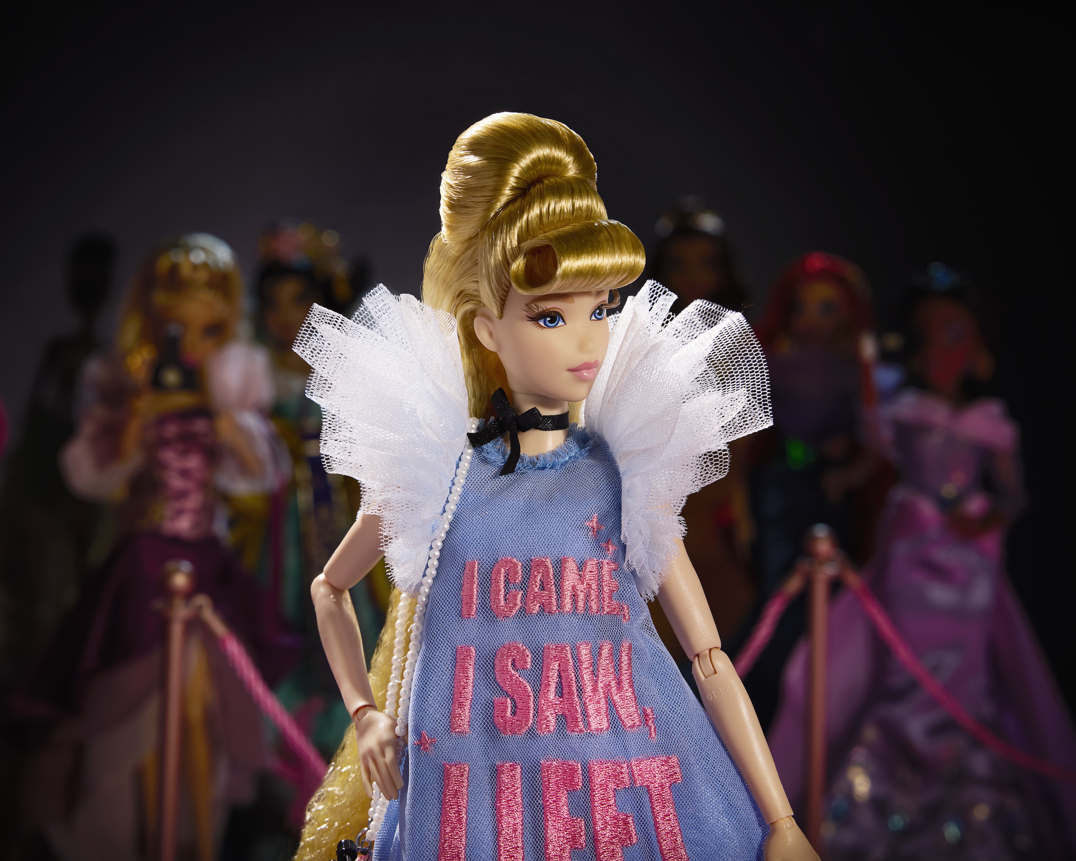 Invoking the words of an ancient Roman dictator, Cinderella issues her world-famous Irish goodbye. The words “I CAME, I SAW, I LEFT EARLY” adorn her blue tulle dress in a bold embroidered print from Viktor&Rolf’s Spring Summer 2019 Haute Couture line “Fashion Statements.” Her shoes are high-heeled and glass, and her cell phone clock is permanently set to 11:59 p.m. This Cinderella is here to stay, and she’s here to play.