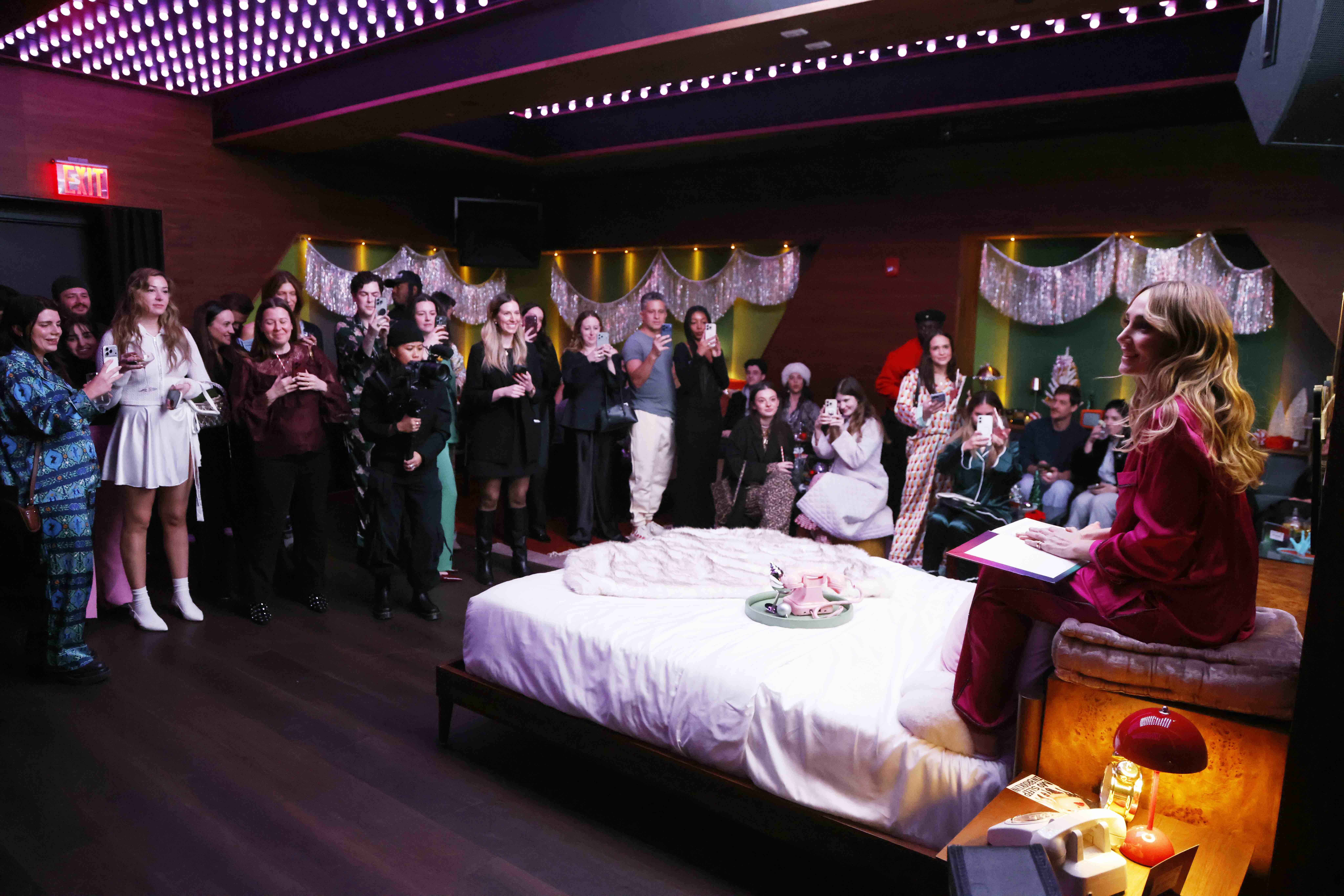 The launch of the partnership was celebrated in true Moxy fashion at Moxy Williamsburg, where Fineman brought the stories to life with a live reading of Merry Peachmas. The lobby—transformed into a space part living room, part performance stage—buzzed with revelers, press, and the most curious, all drawn into the same fever dream of absurdist holiday cheer. There was music, cocktails, laughter, and the unmistakable sense that late-night revelry could bleed seamlessly into the intimate quiet of a guest room.