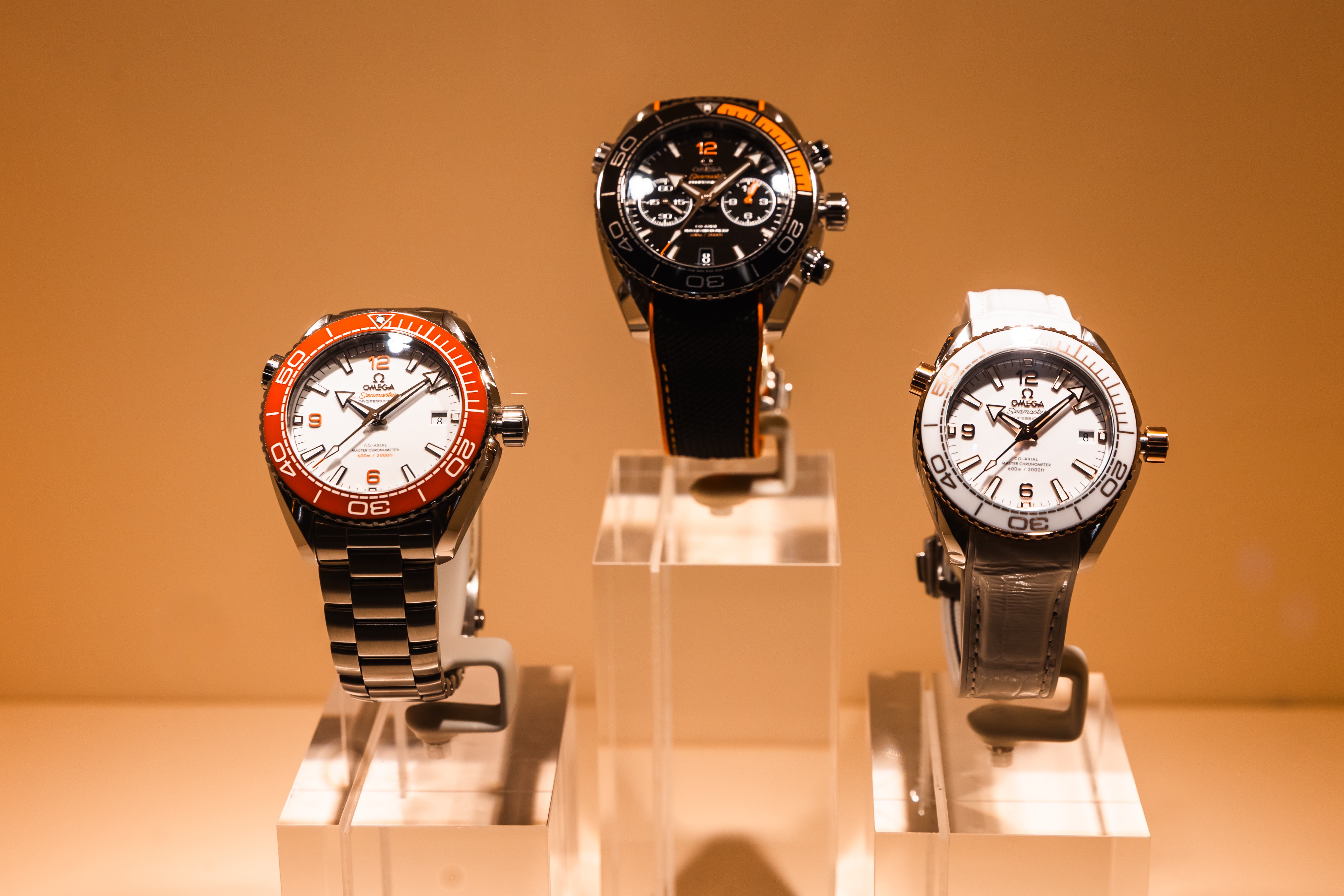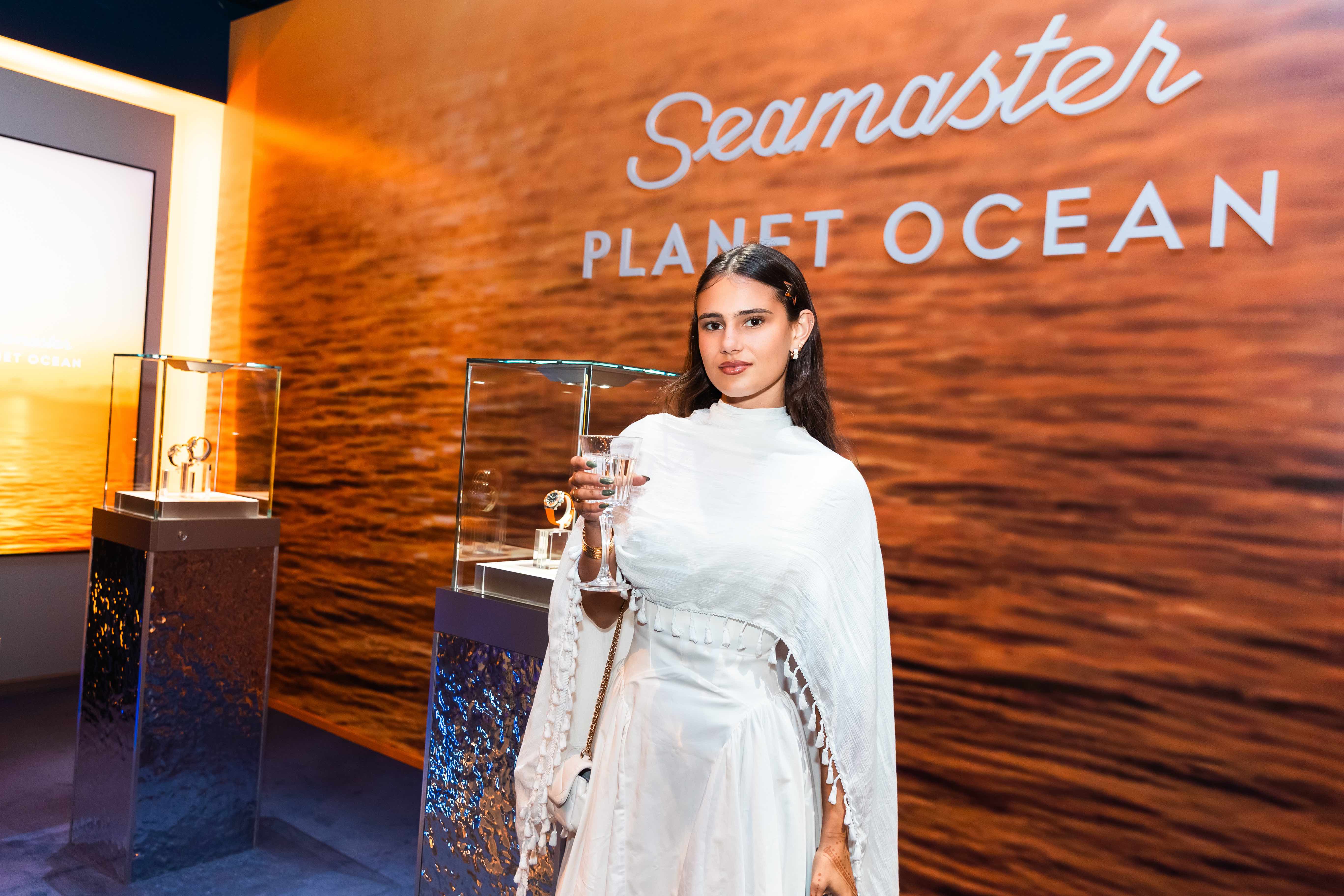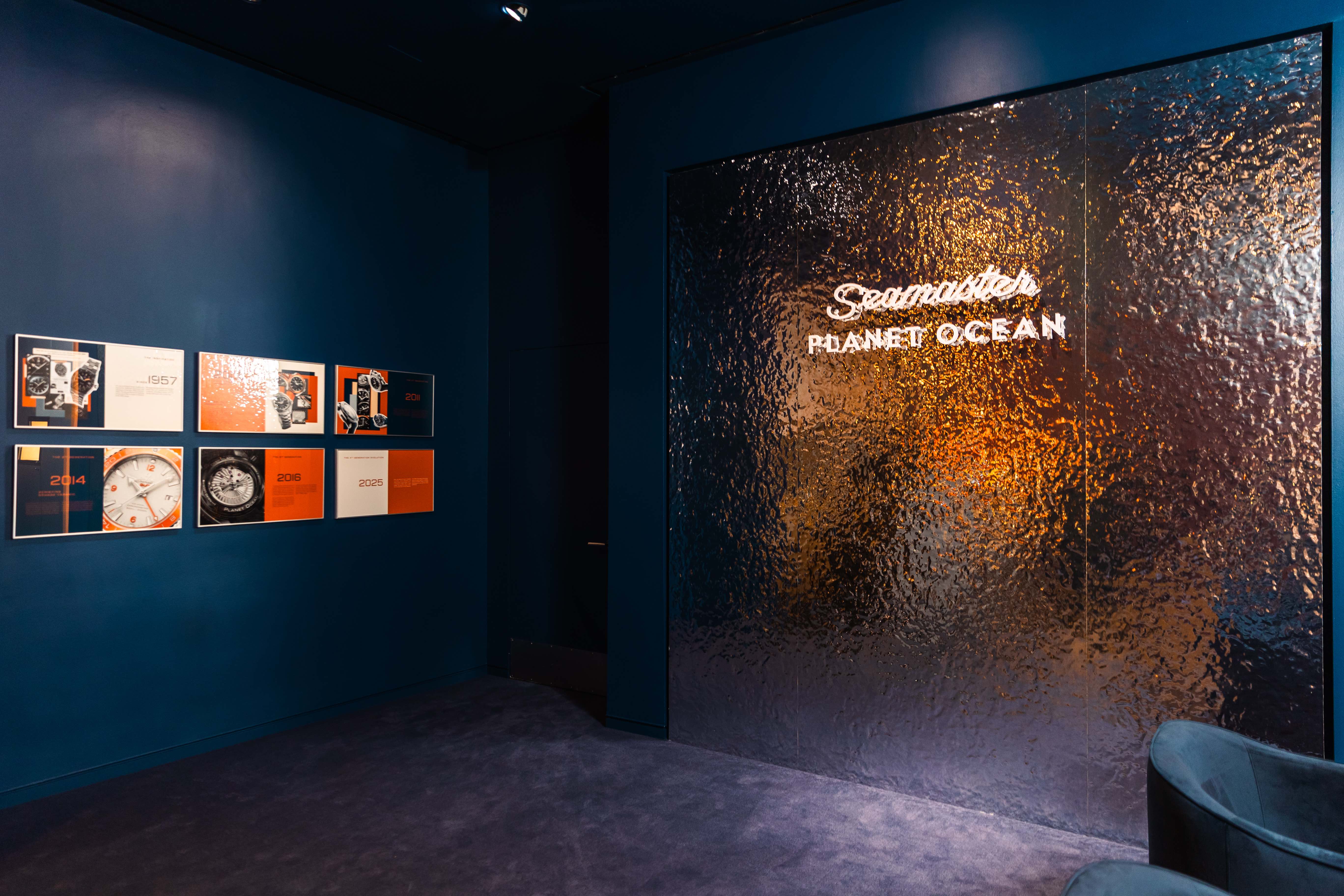 A reflection of the collection’s initiative, the space flowed of texture and gold-plated ambiance; deep blues and stark oranges coating the walls around, while an array of oceanic light projections danced on the floor below. Guests wandered about, mingling, sipping cocktails, and admiring the reimagined Planet Ocean models on display—a curated exhibition where innovation meets technology & style meets performance.