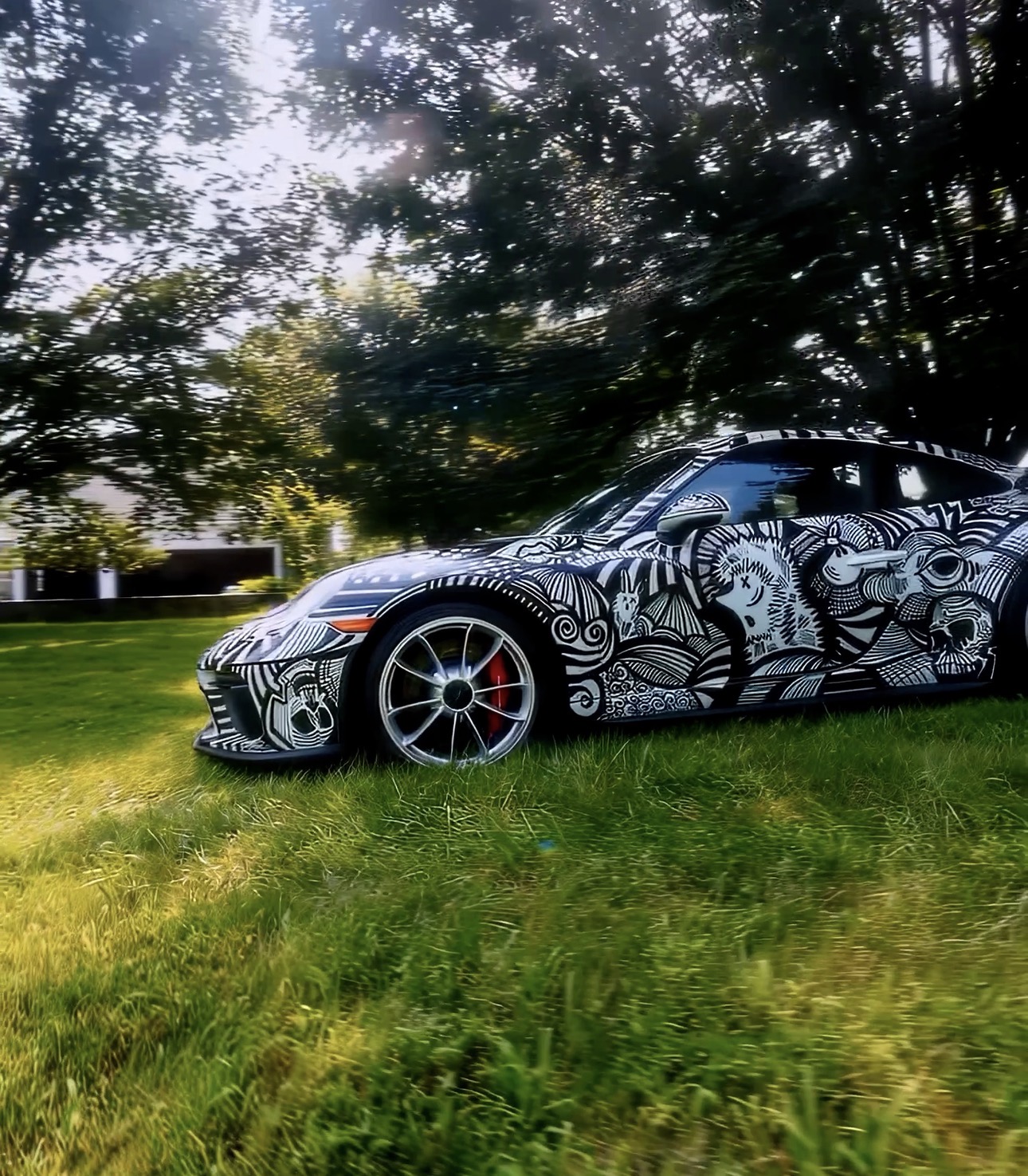 “Hedgehog in the Fog,” by contrast, relies on restraint. Inspired by the iconic animated film, it uses black-and-white illustration to create an atmosphere of quiet, shifting texture. This monochrome approach resonates with broader aesthetic currents. Adobe’s 2025 Design Trends report notes a renewed interest in textured, hand-drawn, and deliberately imperfect visuals, as audiences seek imagery that feels more personal and less digitally manufactured. The project reflects this sensibility in a particularly demanding context. Applied to the sculptural surface of a Porsche GT3, each stroke must pass cleanly across arches, vents, and panel gaps so the fog-like rhythm remains uninterrupted. The effect is closer to contemporary graphic art than to automotive customization, and its restrained palette encourages slower, more attentive looking.