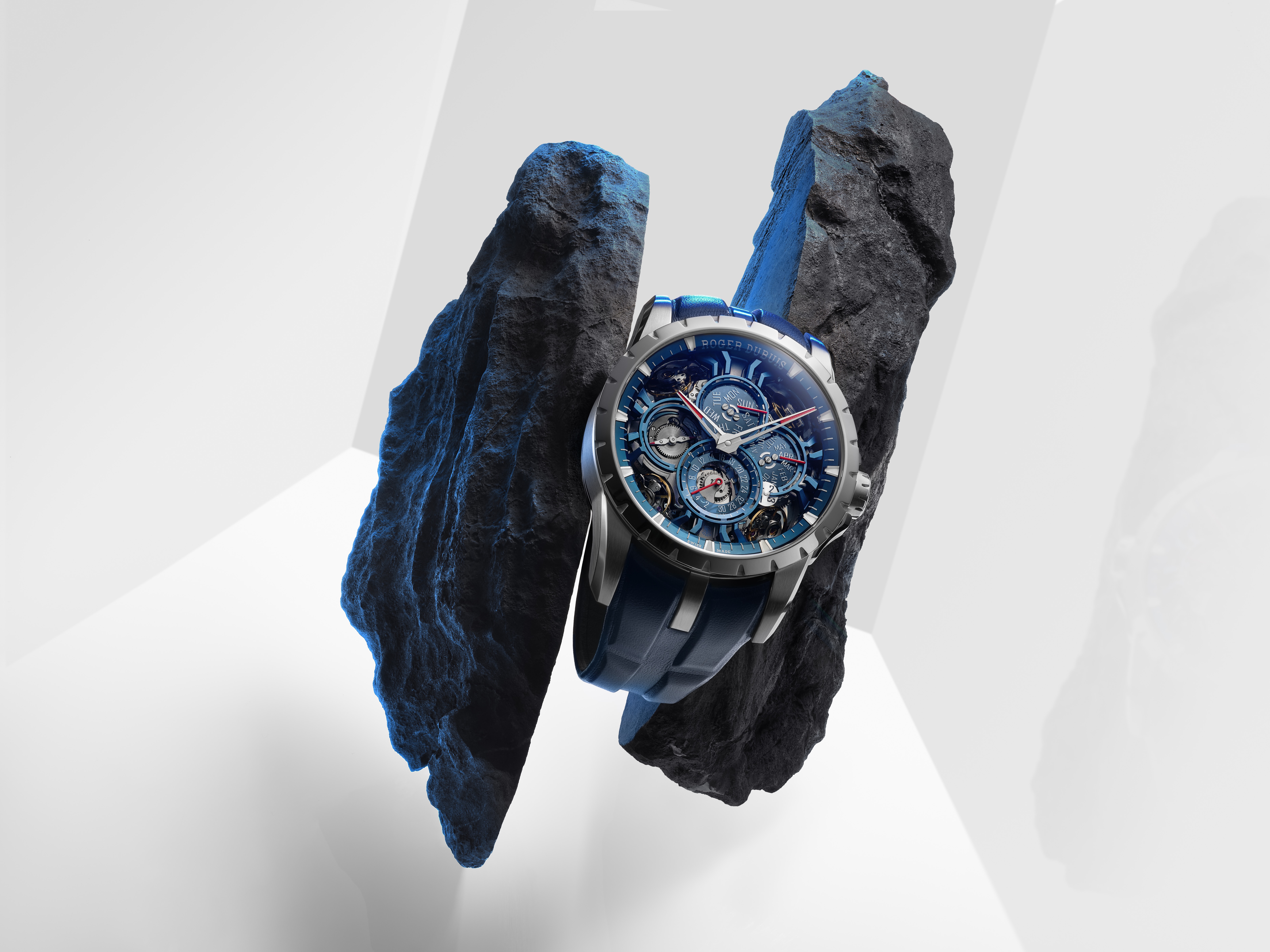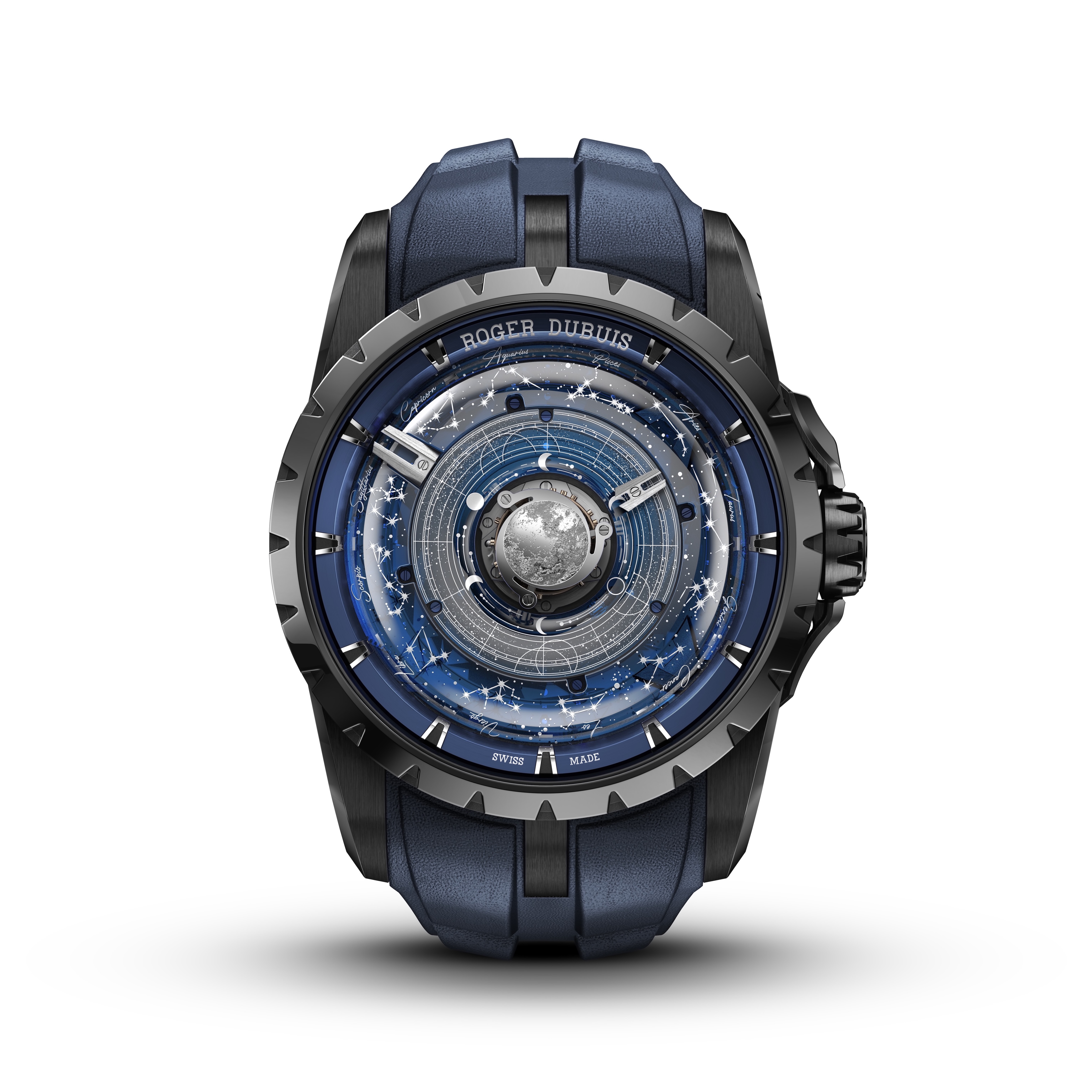 The Excalibur Moonlight, is powered by the Poinçon de Genève–certified Calibre RD115 and features a patented planetary gear train, resulting in time displayed on a rotating Murano-type glass disc. Inspired by the night sky, the 45mm black DLC titanium case display features astronomical motifs including zodiac constellations, lunar imagery, and a rotating moon appliqué; the sapphire caseback features an engraving of the Milky Way.