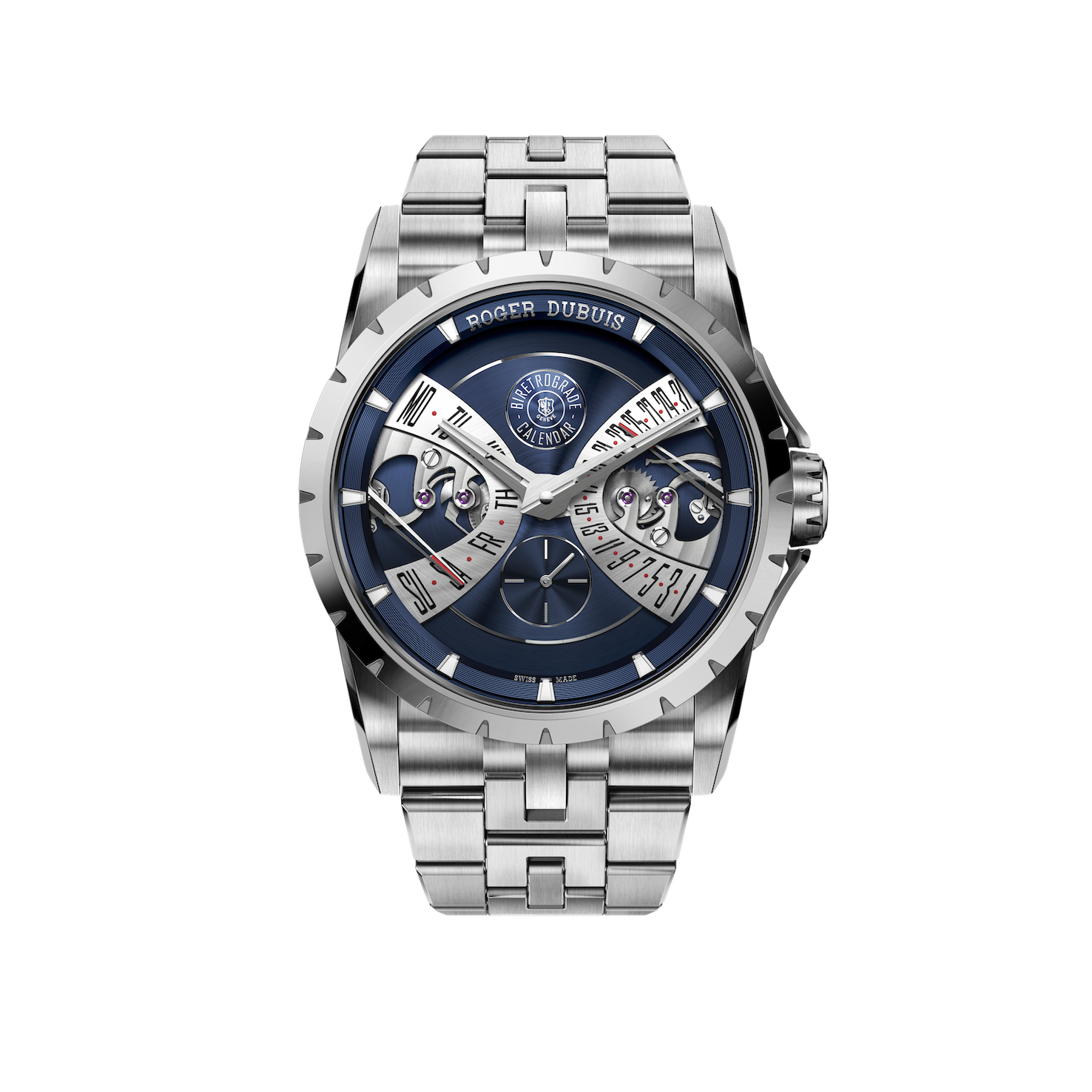 The Excalibur Biretrograde Calendar Steel offers a relaxed expression of the brand’s signature complication. Presented in a 40mm stainless steel case with a multi-link bracelet, the watch features the day and date displayed via the Maison’s patented biretrograde system. Set against a Cosmic Blue dial, the open-worked design reveals finely finished components, combining technical refinement with modern, versatile elegance.