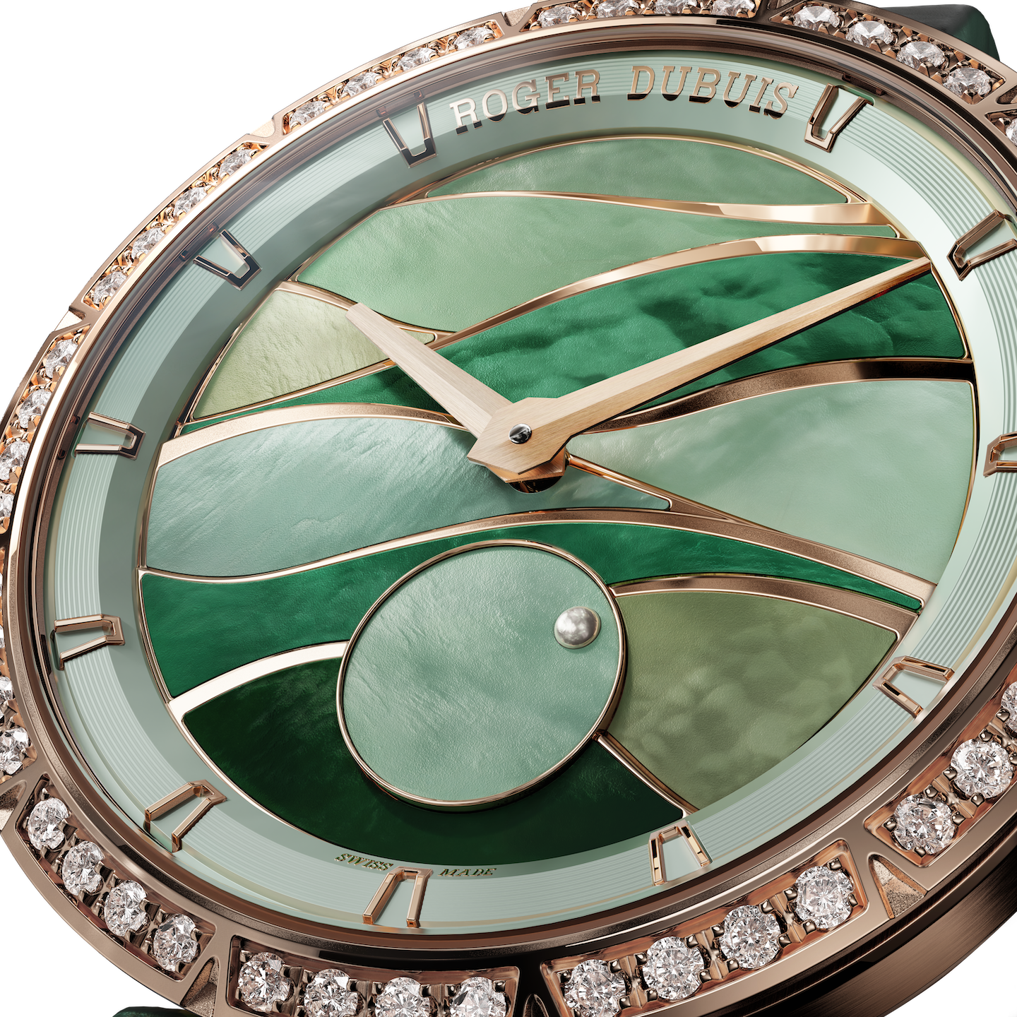 Drawing from the legend of Viviane, The Mysterious Lady of the Lake, Roger Dubuis introduces a 36mm rose-gold watch with a green mother-of-pearl mosaic dial reminiscent of the mystical waters of Brocéliande. The dial consists of hand-lacquered green fragments, complemented by a diamond-set bezel and the automatic Calibre RD830, visible through the sapphire case back. Another version, Excalibur Lady of the Lake, features a Sovereign Grey dial with sword-shaped hands and a 48-diamond bezel, symbolizing strength, armor, and independence.