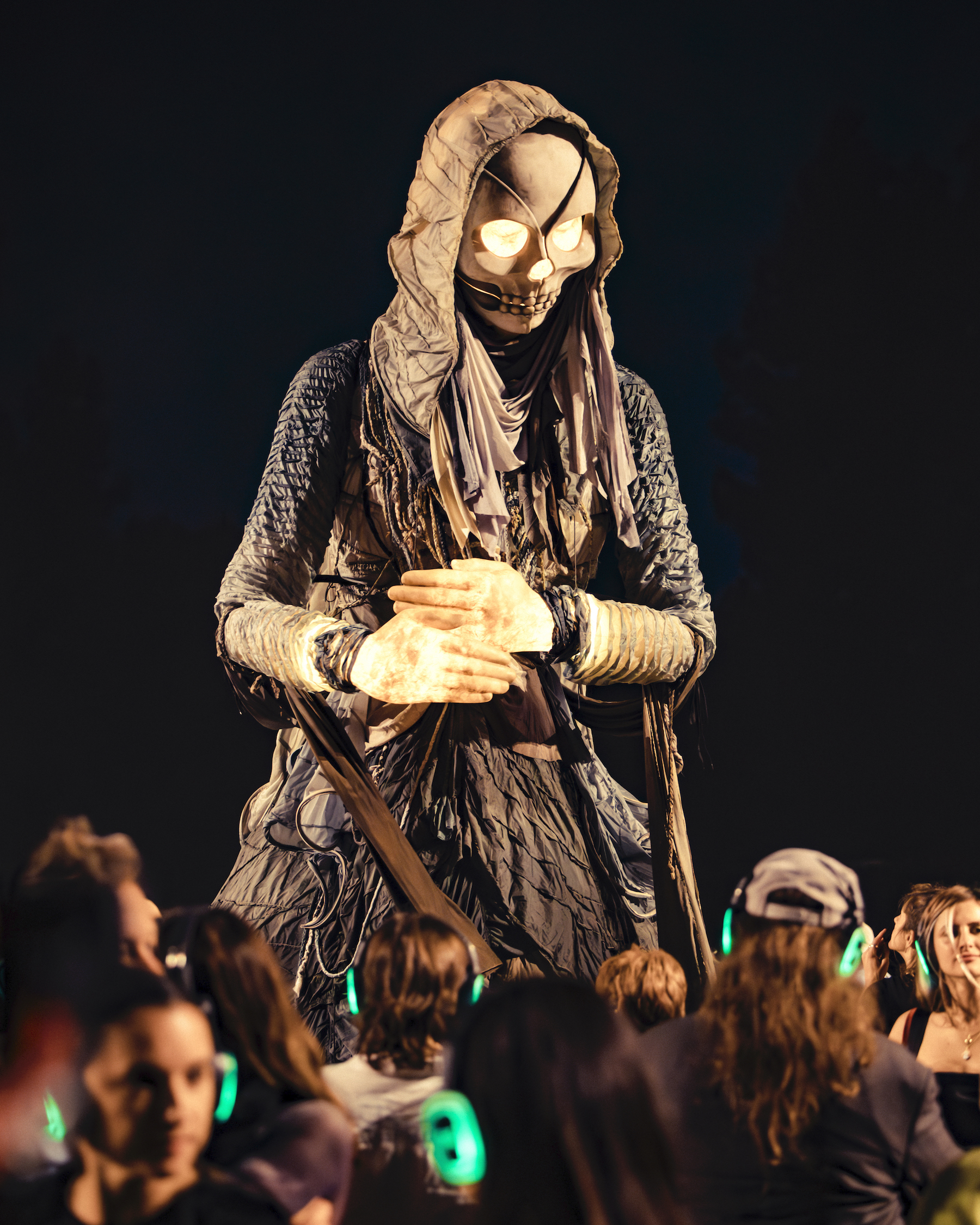 Part ritual, part performance, and part festival, The Cortège transforms the act of mourning into a collective celebration and shared theatrical experience. The evening begins at 6:30 PM with an open-air food market and live musical prelude. By 8:00 PM, the procession begins: a journey between sound and sensation, where archetypal dancers, puppetry, drone apparitions, and robotics come together. Instead of dialogue, a cinematic playlist echoes through wireless headsets, featuring music from TOKiMONSTA, El Búho, Boreta, Andrew Bird, and more, bypassing language altogether and speaking directly to emotion and memory.