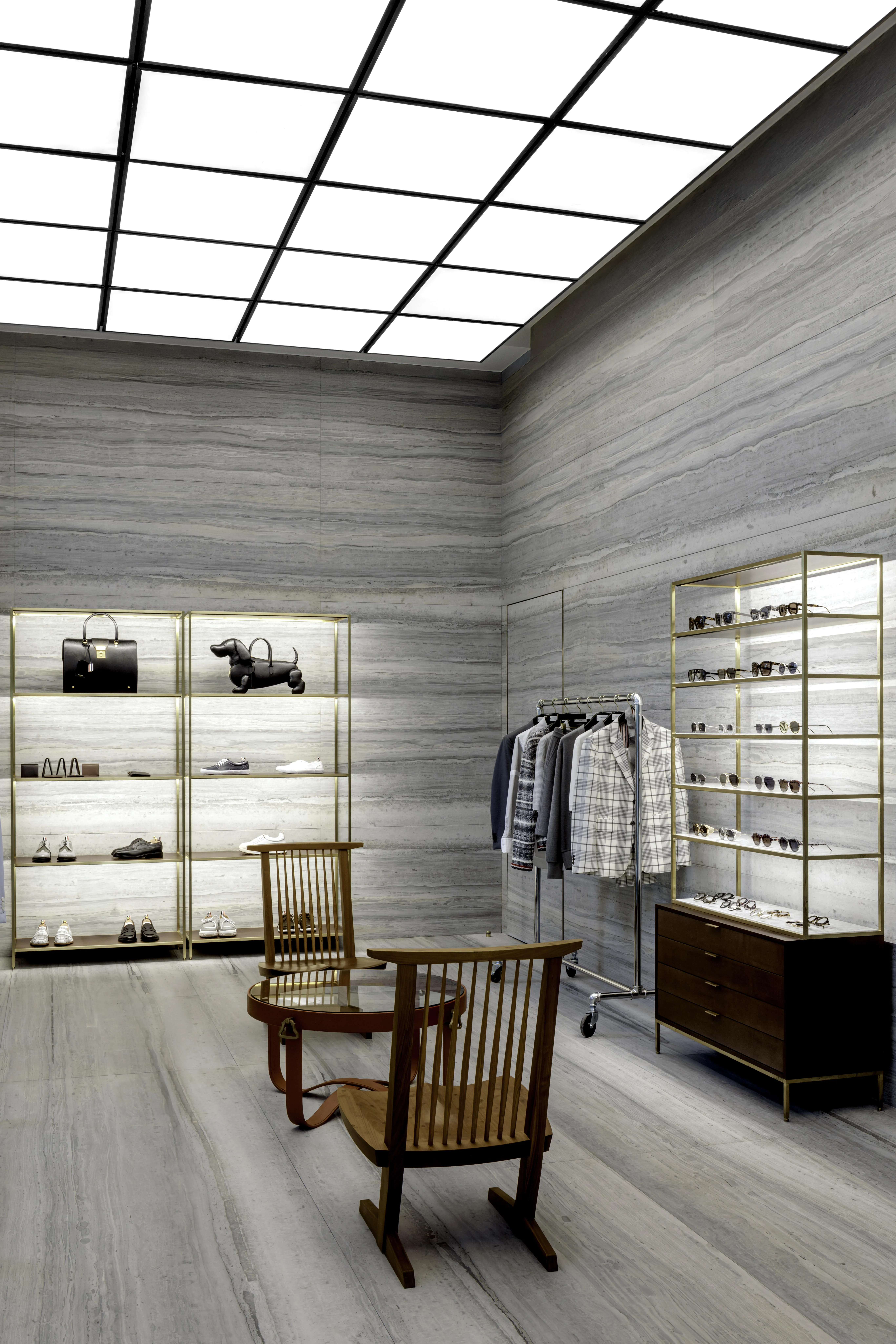 Beyond the façade of a boutique lies an installation. Two distinct chambers – one dedicated to tailored precision, the other to curated collections – offer glimpses into Thom Browne's world. Maison Jansen and McCobb etageres, alongside sleek metal railings, define the space.