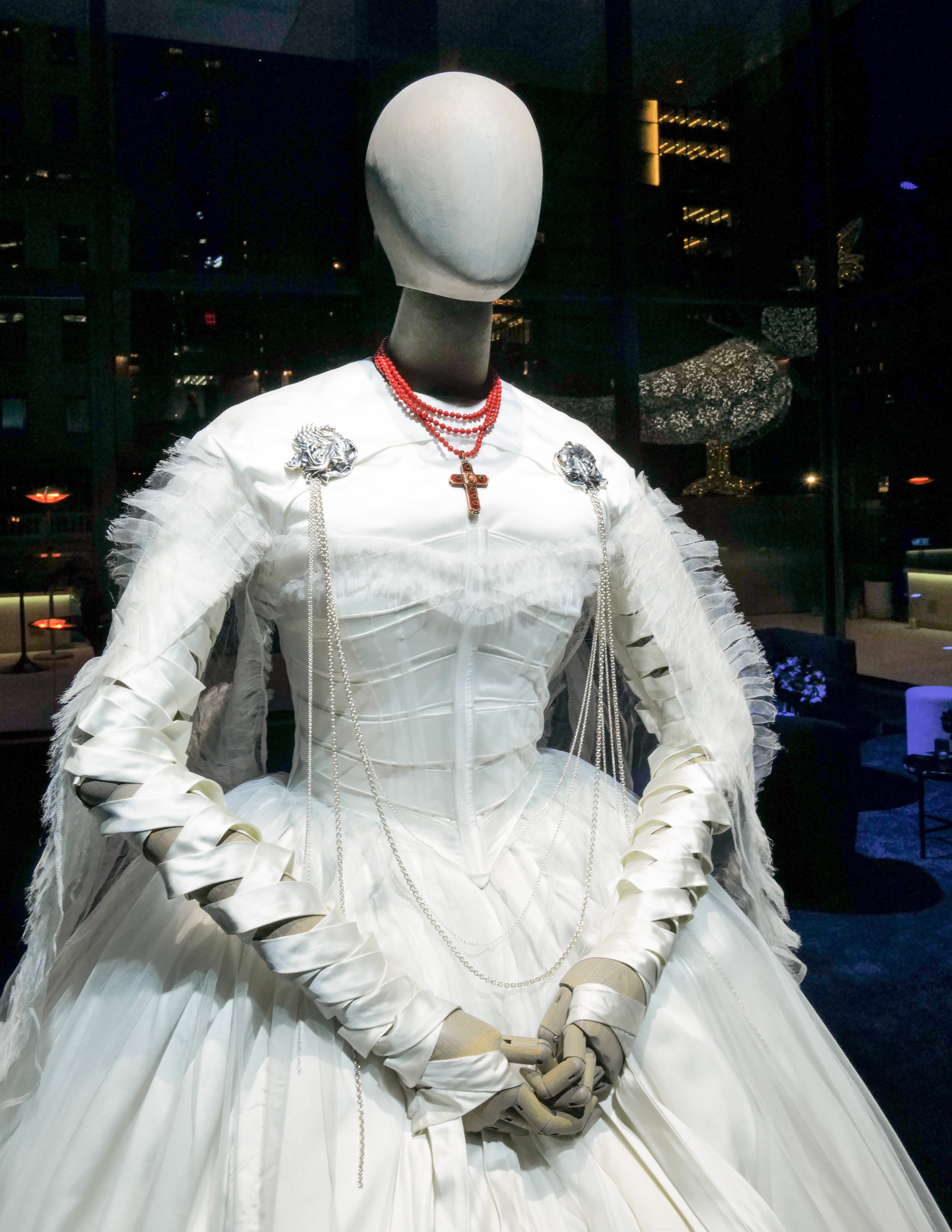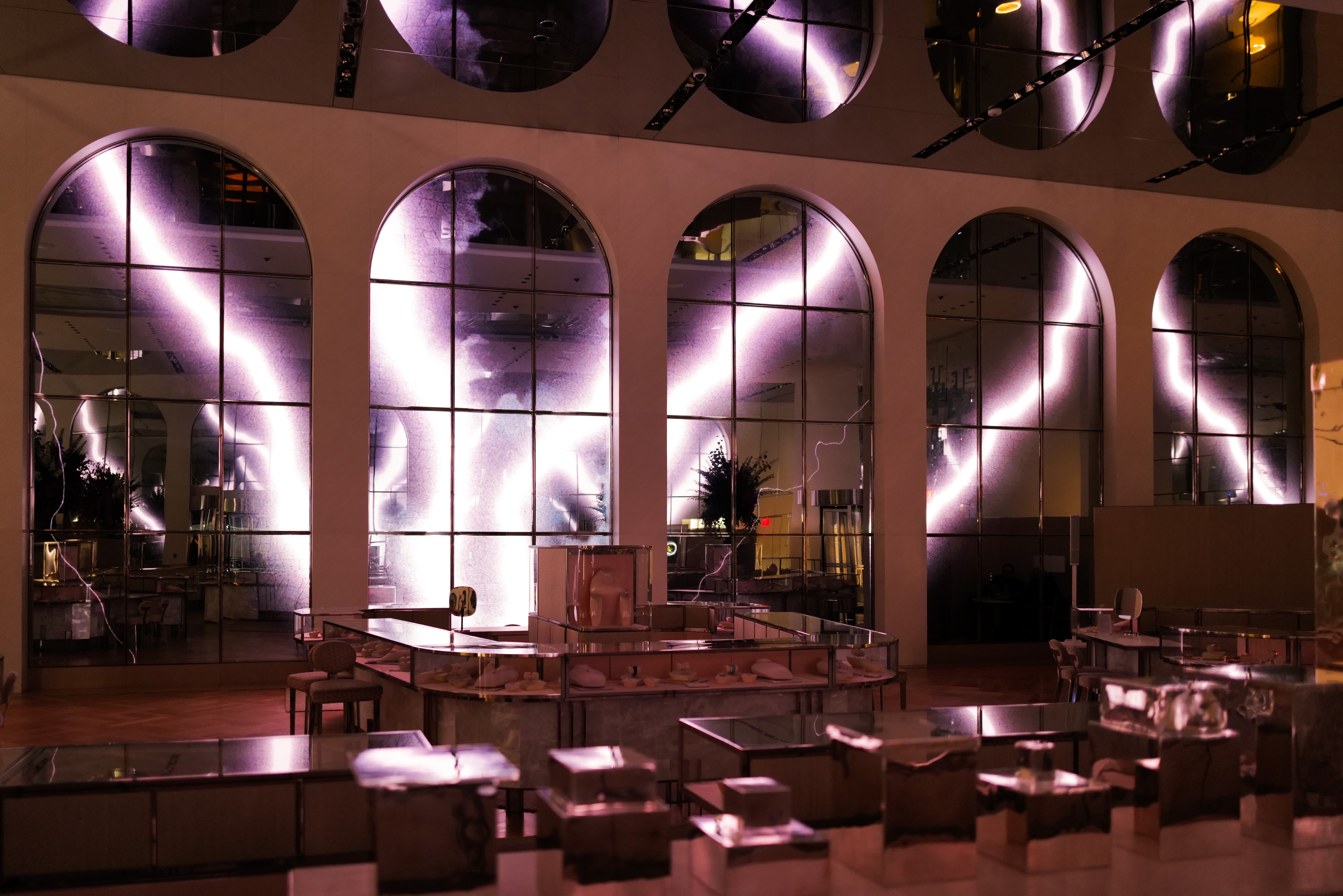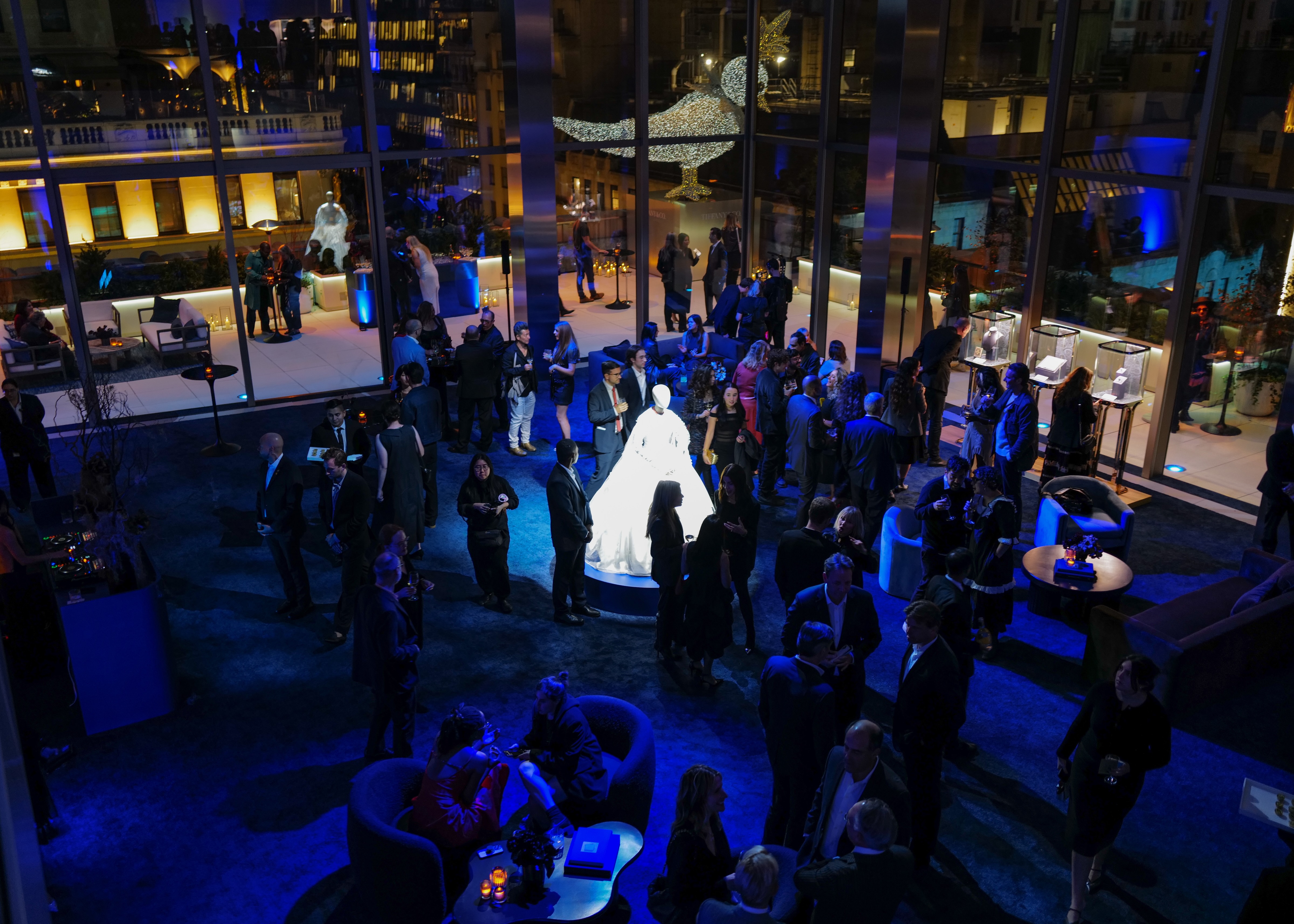 While the premiere had ended, del Toro’s haunting visual world lived on through the night. Tiffany & Co.’s Landmark location on Fifth Avenue was transformed into the heart of Victor Frankenstein’s laboratory—dark, window-filled, and drenched in blue light, with a white wedding gown as the centerpiece. Archival Tiffany jewels, worn by Goth in the film, shimmered alongside original costumes and striking photographic stills, bringing each character’s torment and beauty into vivid focus.
