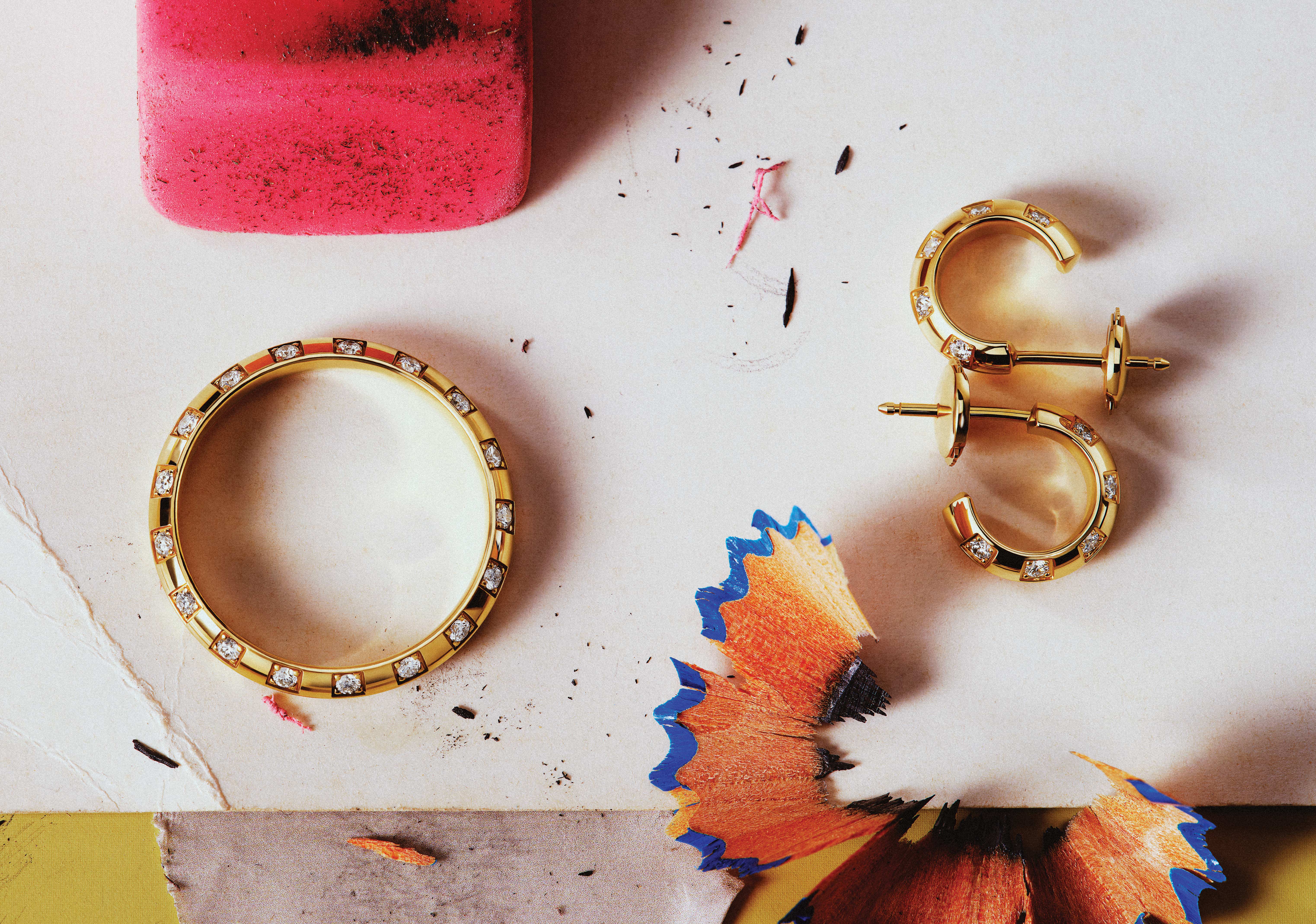 Left to right: Le Damier de LOUIS VUITTON Ring, Yellow Gold, Diamonds. Le Damier de LOUIS VUITTON Earrings, Yellow Gold, Diamonds.